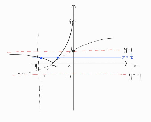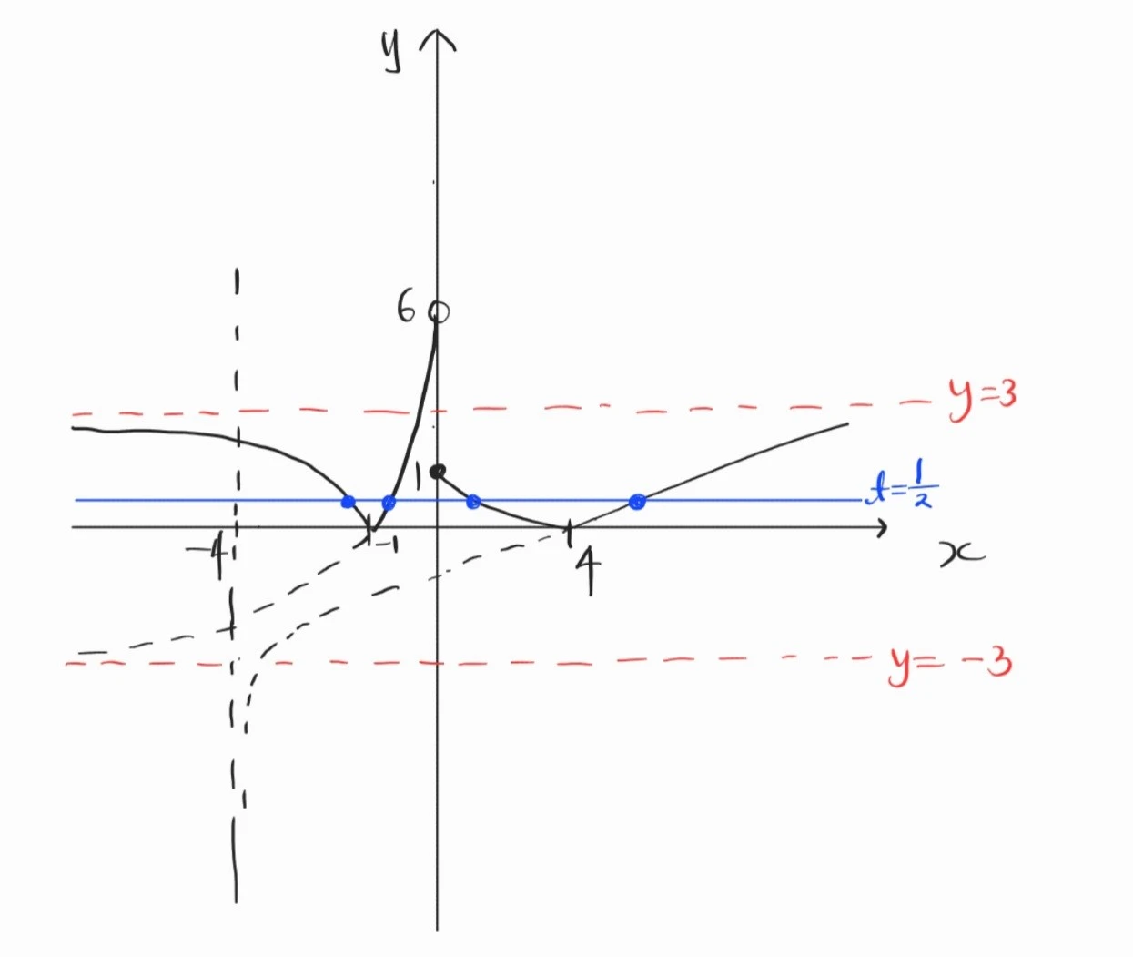 이 그래프를 통해 g(t)를 도출하여 보자. "실수 t에 대하여 방정식 f(x)=t의 서로 다른 실근의 개수를 g(t)라고 한다"는 것의 의미는 무엇일까? f(x)=t라는 것은 함수 f(x)가 t값을 가진다는 말이 되고, g(t)는 f(x)=t를 만드는 x값이 몇 개 인지를 묻고 있는 것이다. 예를 들어 위 그래프에서 t=1/2이라면, f(x)=1/2인 경우의 x값이 몇 개인지 묻고 있는 것이다. 위 그래프에 f(x)=1/2인 직선을 하나 그으면 직선과 만나는 x의 개수가 2개임을 알 수 있다. 그리고 여기서 중요한 "아이디어"가 있다. 그 직선을 가상적으로 아래위로 움직여보는 것이다. 움직여보면 함수 g(t)의 최댓값, 즉 f(x)=t 일 때, 고려할 수 있는 g(t)의 최댓값이 2라는 것을 확인할 수 있다. 즉, g(t)=2가 되는 것이다.