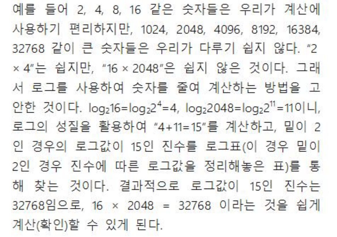 로그 함수는 엄청 큰 숫자를 작은 숫자로 줄여 계산을 쉽게 하기 위해 만든 개념이다. 로그 함수 그래프를 떠올려보면 x축의 값이 증가할수록 y축의 값이 완만한 곡선을 이루며 증가하는 것을 확인할 수 있다. 즉, x값이 크게 증가하더라도 y값은 조금만 증가하는 것이다. 이러한 성질을 활용하면 큰 숫자를 계산하기에 용이하다.
