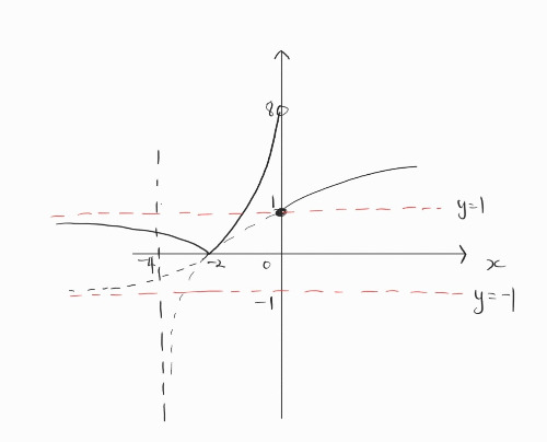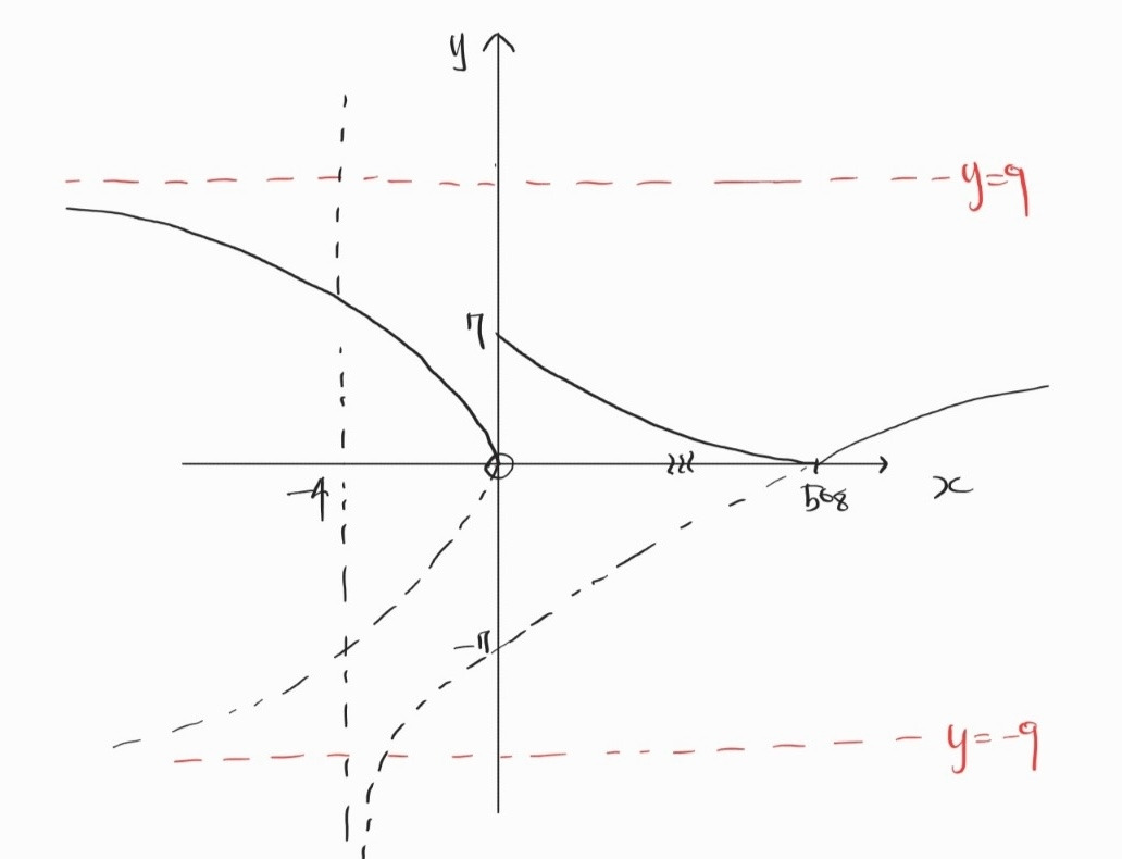 우선 함수 f(x)를 그려보도록 하자. x=0이라면 f(0)의 값은 지수함수의 경우 f(0)=l9-nl, 로그함수인 경우 f(0)=l2-nl이 된다. 여기서 n의 값에 따라 f(0)의 값이 바뀐다. n=1이 되면 지수함수의 경우 f(0)=8, 로그함수의 경우 f(0)=1이 된다. 이를 통해 지수함수, 로그함수 각각 (0, 8), (0, 1)을 지나는 함수임을 확인할 수 있다. 이를 바탕으로 각 함수의 특징과 x값의 범위에 맞게 그래프를 그린 후, 절댓값을 적용하여 그래프를 최종 완성하여 준다. 이를 그리면 아래와 같다.