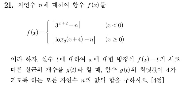 이 문제는 어떻게 풀어야 할까? 우선 지수함수, 로그함수, 절댓값의 개념을 정확하게 적용하여 함수 f(x)를 그래프로 도해하여야 한다. 뿐만 아니라 방정식과 함수의 개념을 정확하게 알고 있어야 “함수 g(t)의 최댓값이 4”가 되는 경우를 따져볼 수 있다.