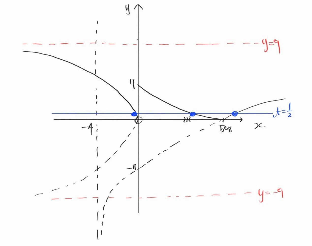 여기서 일일이 모든 그래프를 그리는 걸 수능 수학은 원하지 않는다. n을 1씩 증가시켜서 g(t)=4가 시작되는 n과 끝나는 n을 추론할 수 있어야 한다. 즉, 위와 같은 그래프의 형태가 언제 시작되고, 언제까지 유지되는지 생각해 보는 것이 문제가 요구하는 아이디어인 것이다. 결국 n을 1씩 증가시키면서 그래프 형태를 생각, 확인하다 보면 n=3에서 시작된 그래프 형태가 n=8까지 유지되고, n=9가 되면 지수 함수로 인해 그래프 형태가 바뀌는 것을 확인할 수 있다. n=9일 때 g(t)=3 임을 그래프 도해를 통해 확인하면 아래와 같다.