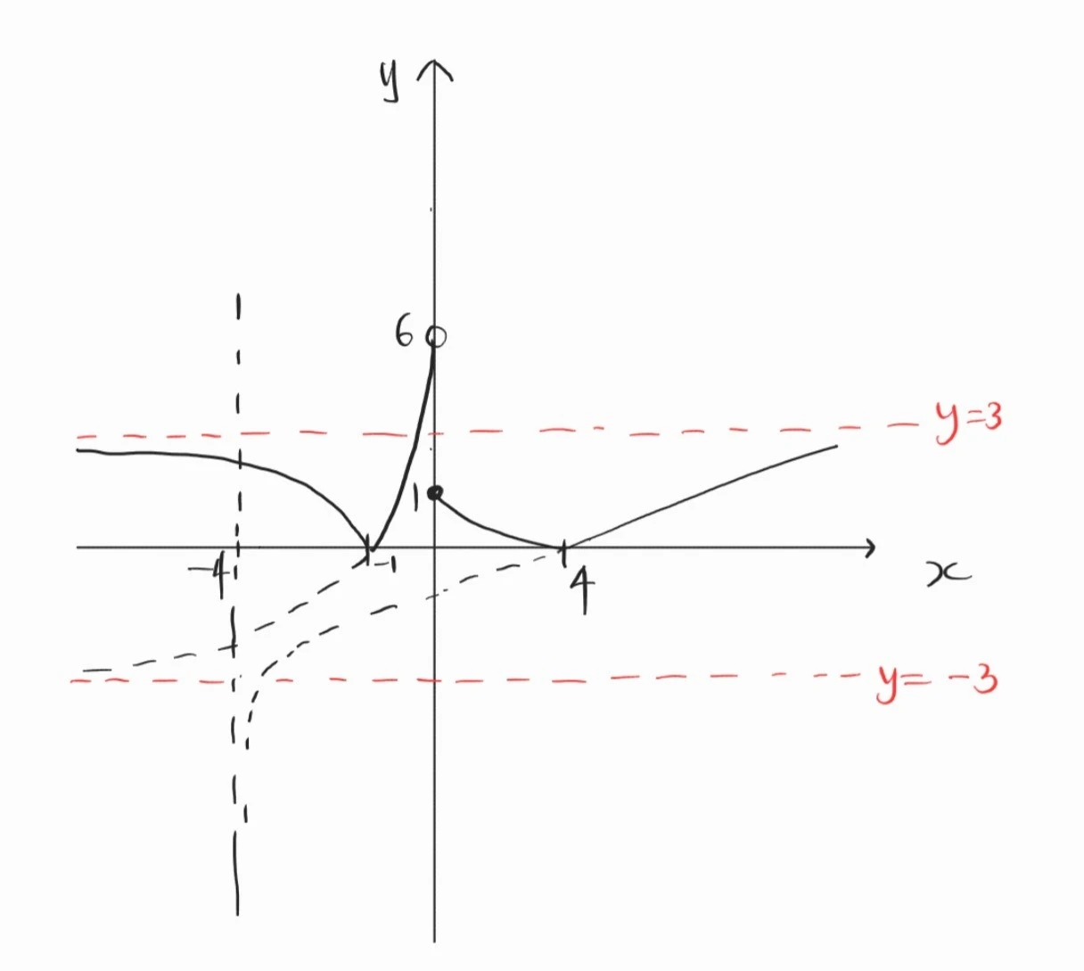 이제 이를 바탕으로 g(t)=4를 만들기 위해 n값을 조정해 보자. n은 자연수이기에, 1씩 올려보자. n=2가 되는 경우의 그래프를 그려보는 것이다. 그러면 아쉽게도 g(t)=3 임을 확인할 수 있다. n=3이면? 이 때는 로그함수가 절댓값의 영향을 받아 형태가 변화한다. 결과적으로 g(t)=4 임을 확인할 수 있다.