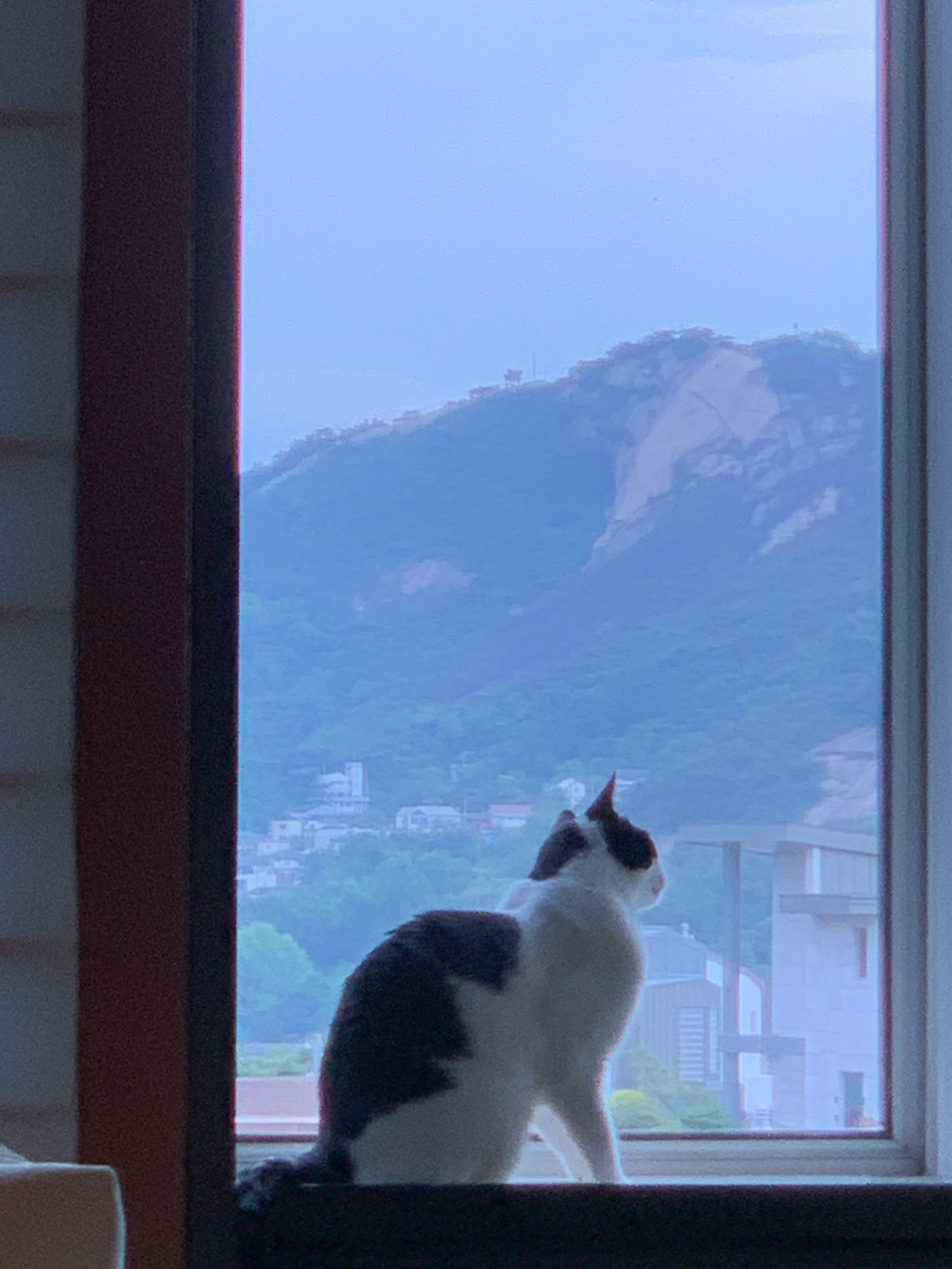 <동네를 굽어살피는 것을 좋아했던 우리 애기. 그래서 종종 얌신령이라고 불러 주었었다. 야몽이가 무지개다리를 건넌 날 저녁, 내가 저 자리에 서서 야몽아 잘 도착했니라고 물었을 때 구름 안에서 번개가 번쩍번쩍하는 것을 보았다. 내 생전 그런 구름과 번개는 처음 보았다. 나는 그 이후로 아내에게 우리 애기는 구름이 되었다고 이야기해 준다. 하얗고 까만 구름이 되었다고>
