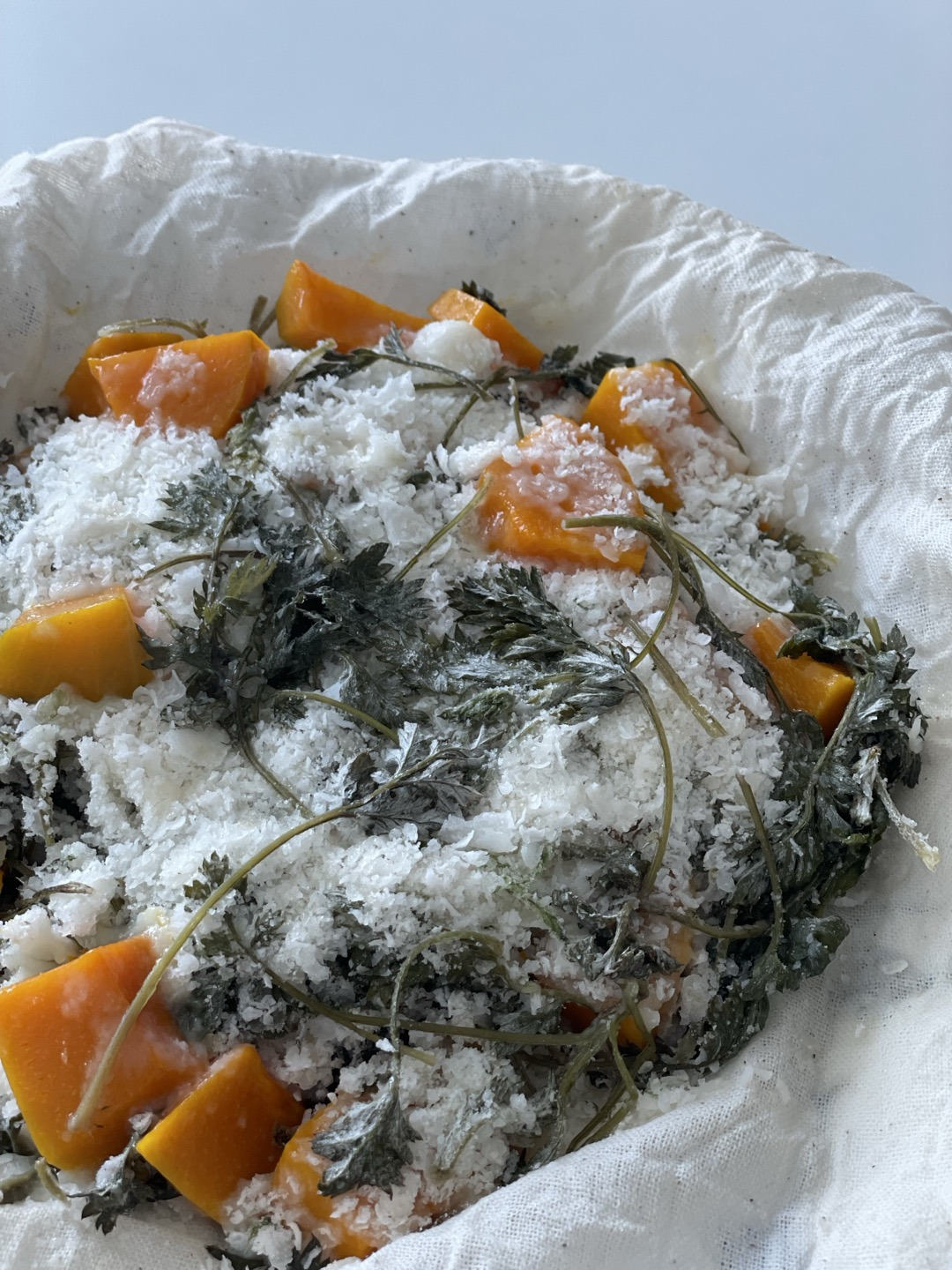 3. 쌀가루에 단호박, 쑥을 넣고 섞어준다.