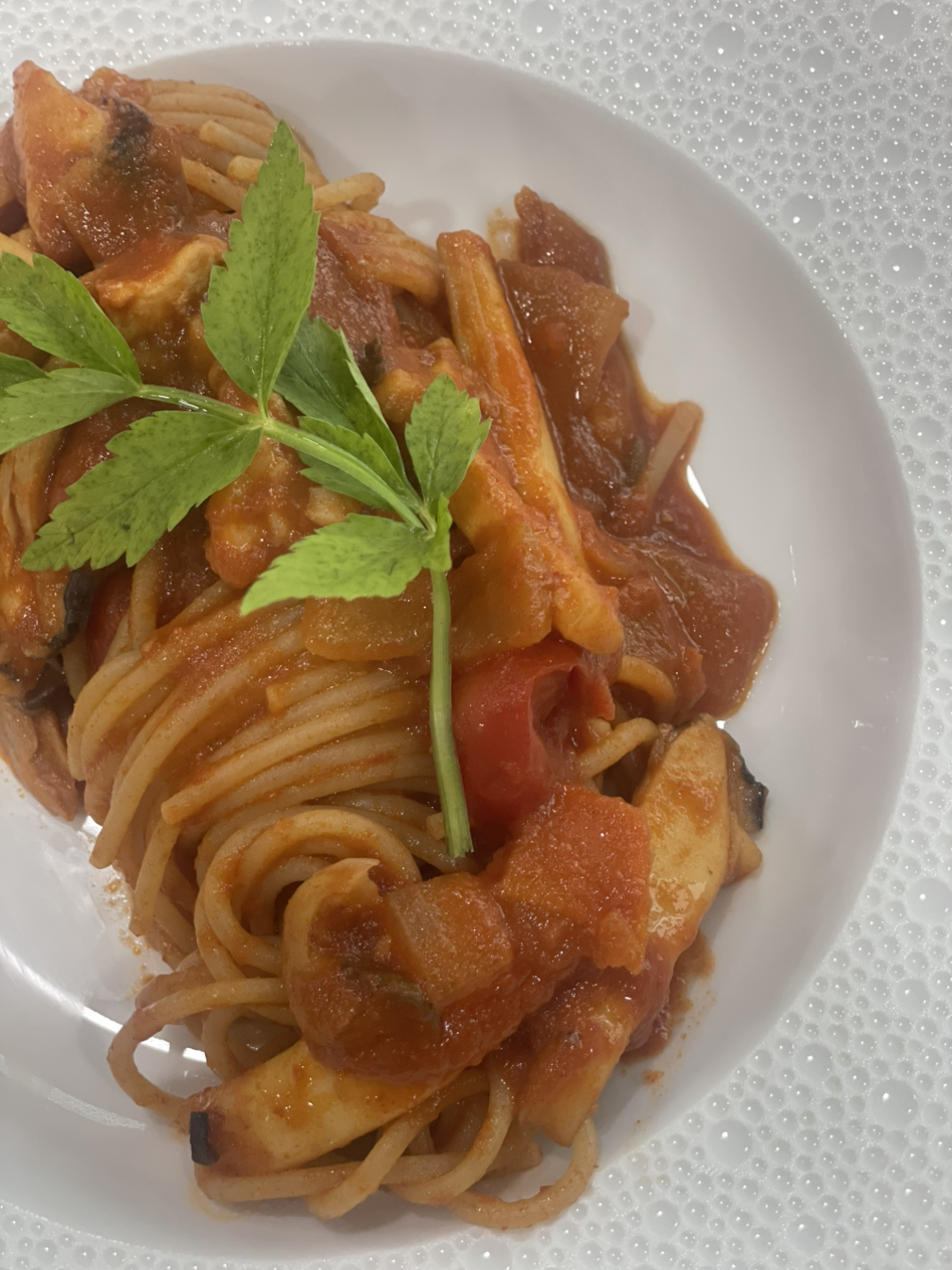 “갑오징어로 토마토 스튜 만들어볼려고, 원한다면 파스타도 넣어주고.”