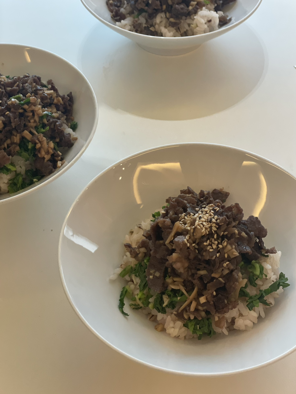 5. 그릇에 밥을 담고 냉이를 먼저 올린 후 볶아놓은 고기를 보기좋게 얹어주면 끝. (참깨는 옵션)