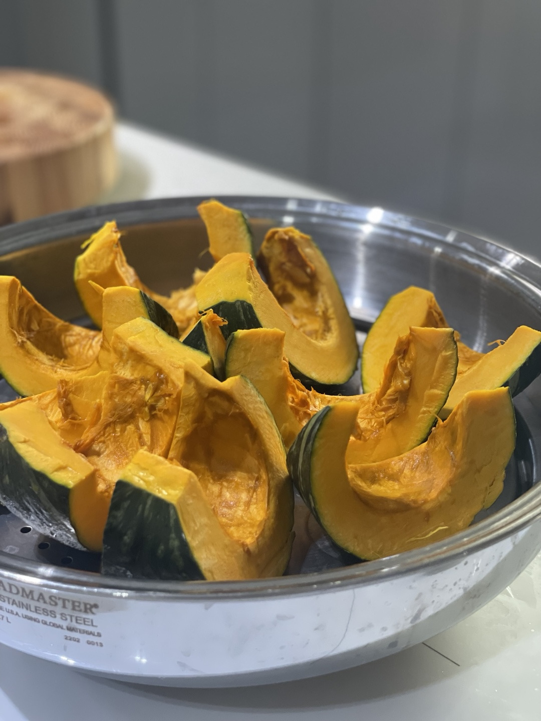1. 계란을 삶을 동안 미리 쪄 둔 단호박을 다져주고, 초당옥수수를 칼로 잘라 알갱이를 분리해준다.