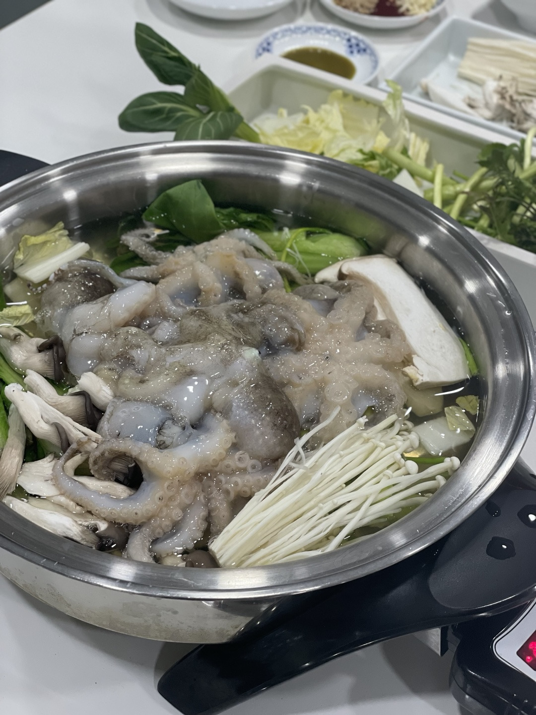3. 육수에 채소와 주꾸미를 넣고 뚜껑을 닫은 후 바포벨브가 울리면 뚜껑을 열어 주꾸미를 먹기좋게 잘라준다. 머리는 따로 떼서 충분히 더 익혀준다.