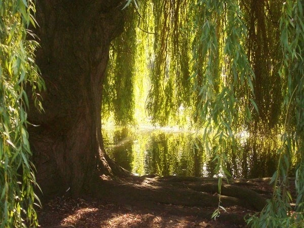 버드나무 커튼 사이로 보이는 작은 실금의 햇빛은