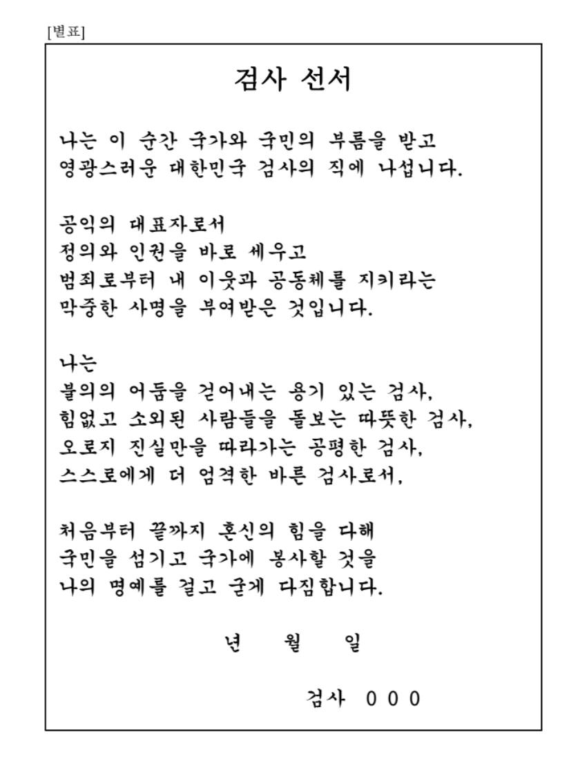 제2조 (검사 선서) 검사는 취임할 때에 별표의 선서문에 따라 선서하여야 한다.