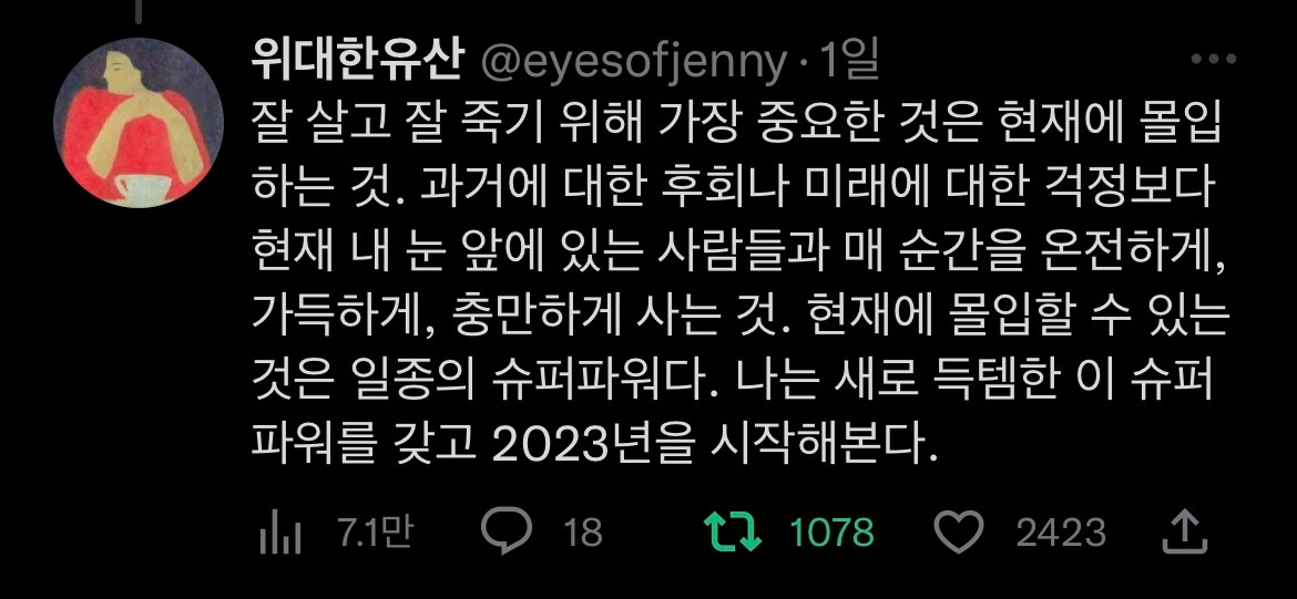 '과거에 대한 후회나 미래에 대한 걱정보다 현재 내 눈앞에 있는 사람들과 매 순간을 온전하게, 가득하게, 충만하게 사는 것'