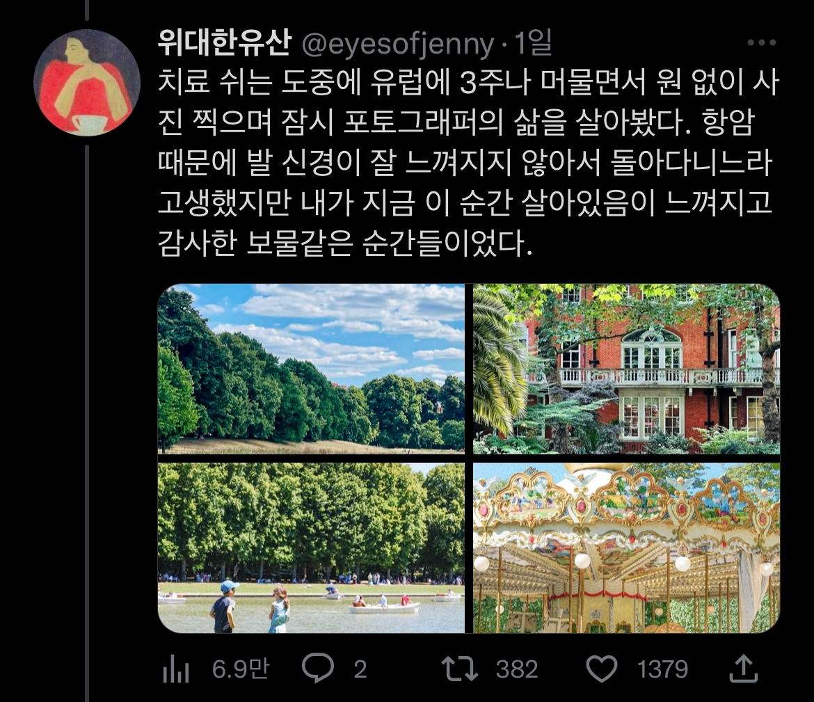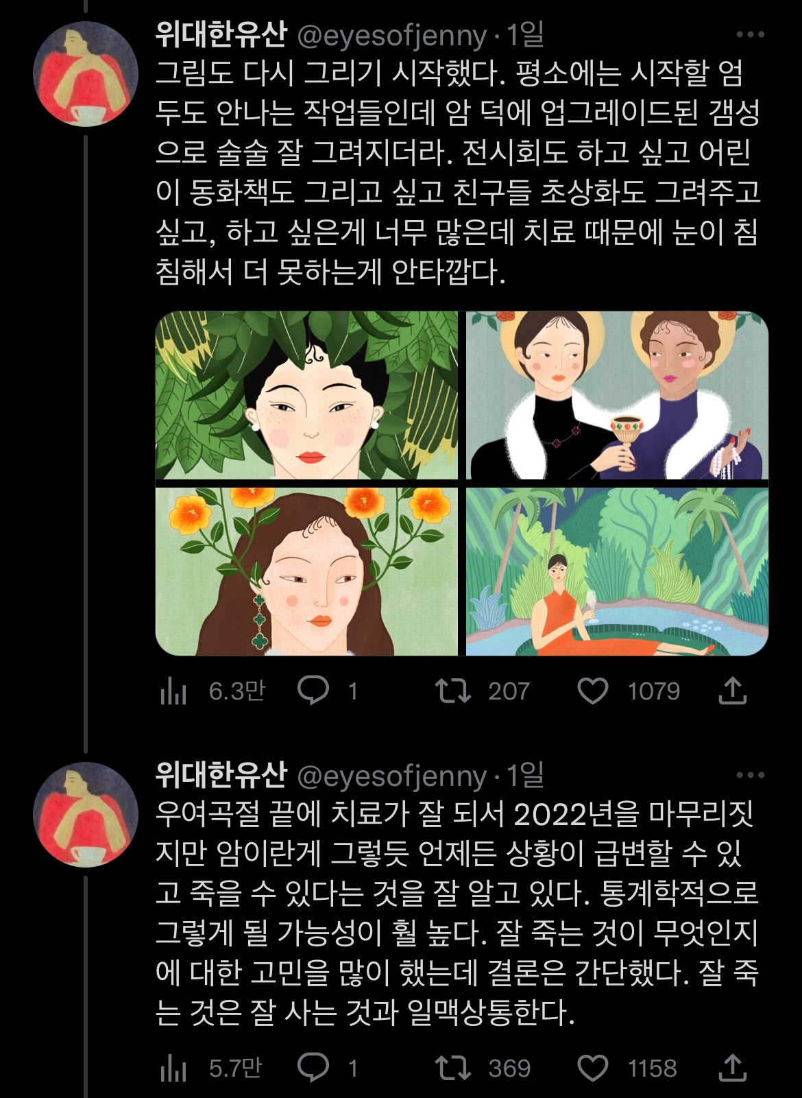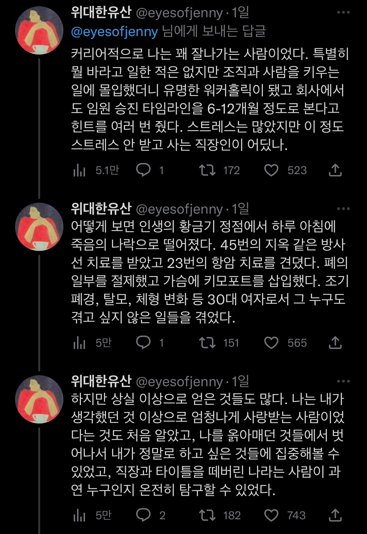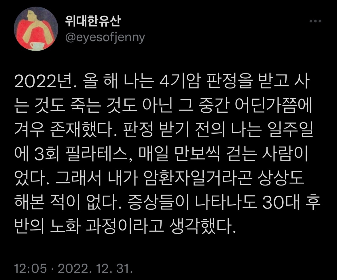 그 글은 2022년 4기 암판정을 받은 분의 것이었는데, 직장 내에서 승승장구하며 평소 운동을 꾸준히 하던 분이었지만 안타깝게 몹쓸 병에 걸려 항암치료 중인 분이었다. 그분이 22년 한 해를 병마와 싸우며 12월 31일 마지막 날에 남긴 글이었다.