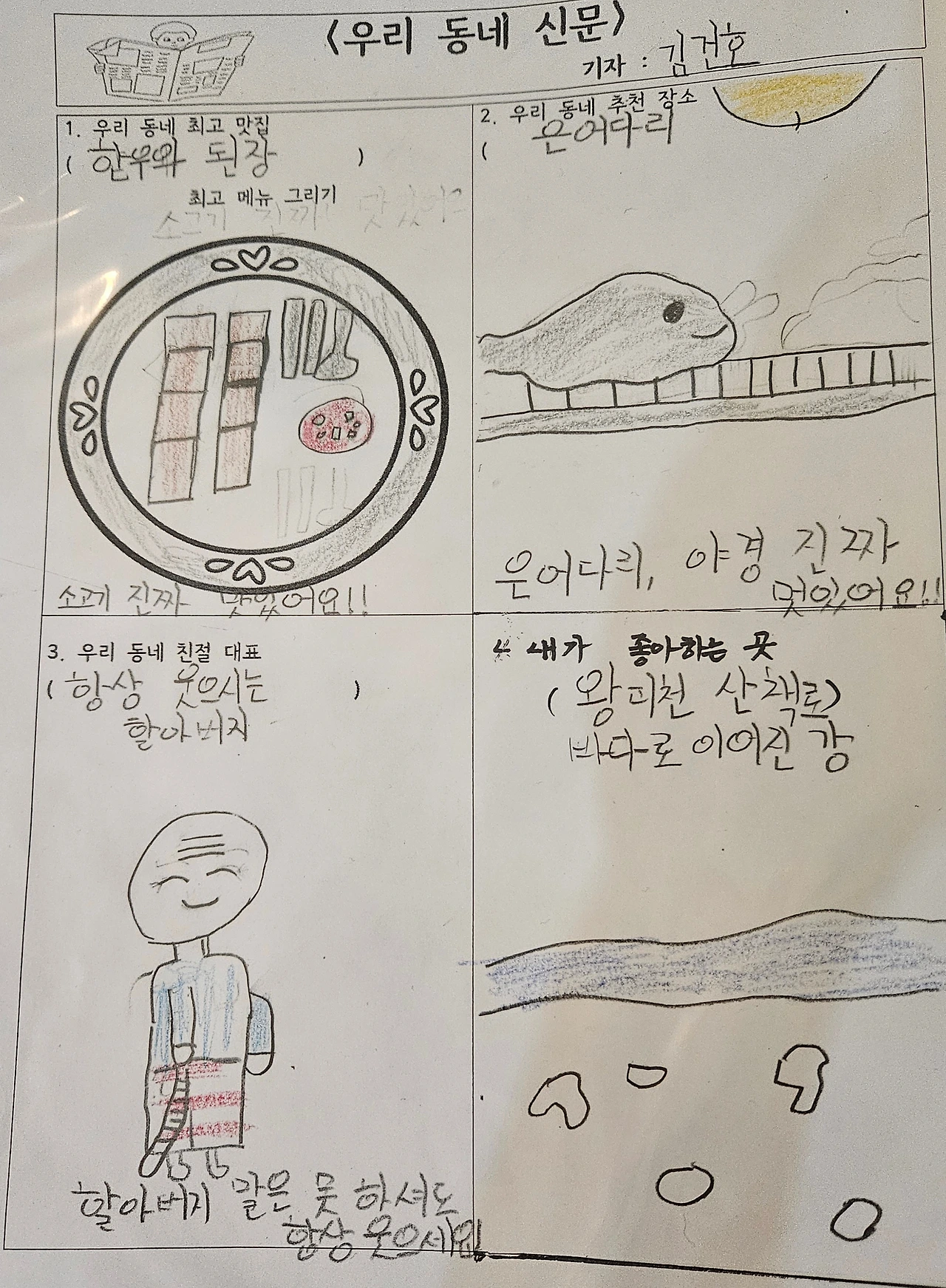 아이가 방학이라고 가지고 온 학기 중 수업했던 자료들 중에는 “우리 동네 신문”이라며 만든 것이 있었는데 할아버지를 보여드리려고 찍어뒀던 게 생각이 났다.