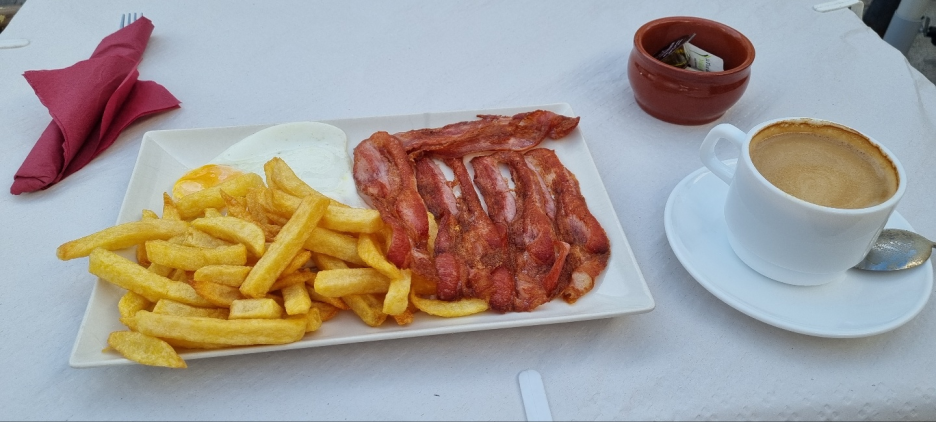 그 날 밤은 한번도 깨지 않고 너무나 잘 잤다. 역시 저 멀리 성당 종소리를 아득히 들으며 평화로운 아침을 맞았다. 아침으로는 근처 식당에서 브런치 세트로 감자튀김과 달걀 후라이, 까페 꼰 레체(까페라떼)를 먹었는데 이 단순한 메뉴가 이렇게 맛있을 수가 있는지! 올리브유에 기본적인 식재료가 신선하니 어떻게 요리를 해도 맛있는 것인지도 모르겠다.