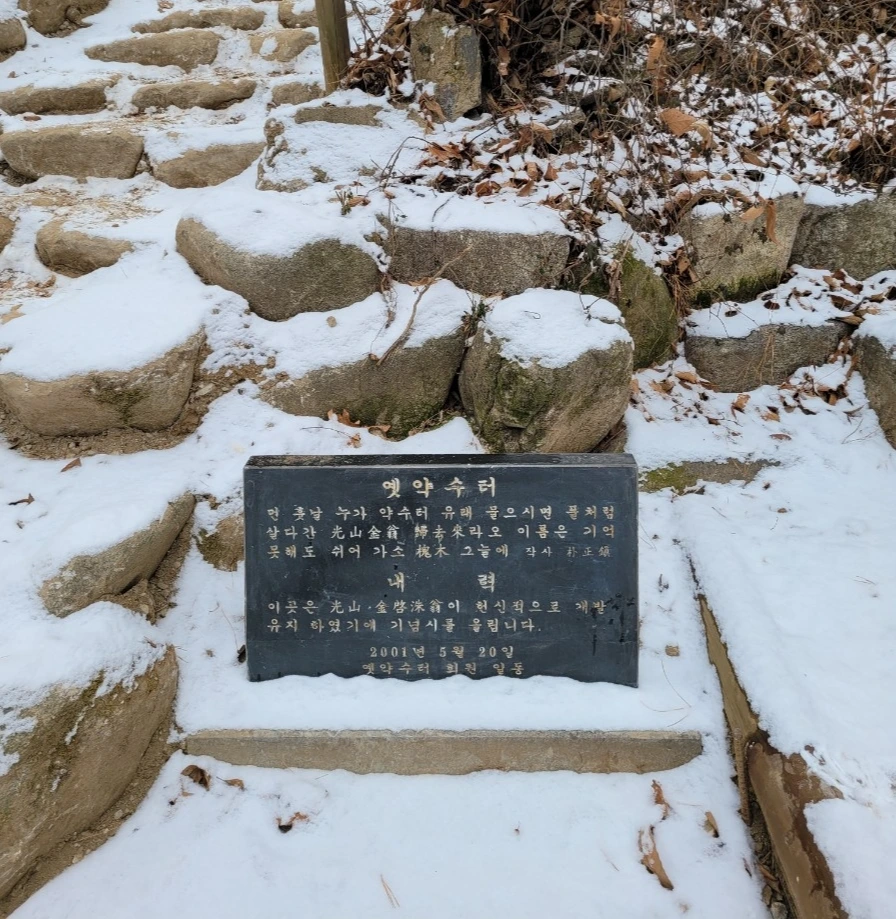 대모산은 크지 않아도 유난히 약수터가 많다. 내가 자주 다니던 임록천 약수터를 찾아갔다. 이 약수터는 오늘도 여전히 깨끗하게 정리가 되어 있고, 주변 바닥에는 흰 눈이 소복하게 쌓였다. 나는 나뭇가지로 "수수문학 건강 제일! 복 많이 받으세요"라는 글을 써, 수수문학 작가들에게 새해 인사를 보냈다.