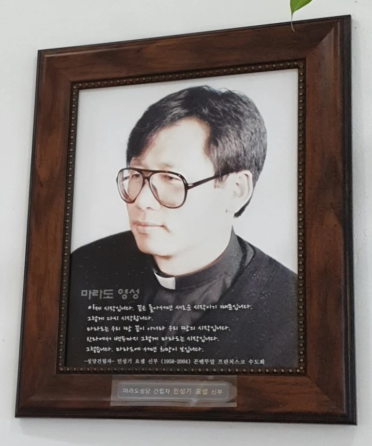 성당은 마라도 해역에서 많이 잡히는 전복과 문어와 소라를 형상화하여 디자인했다고 한다. 성당입구에 이 성당을 설립한 민요셉 신부님의 초상화가 눈에 띄었다. 왠지 외롭고 쓸쓸한 모습이었다. 어떤 연유로 신부님이 마라도에 왔는지 알 수 없고, 57세를 일기로 2004년에 선종하셨다. 꼰벤뚜알 프란치스코 수도회 소속의 신부님이다.