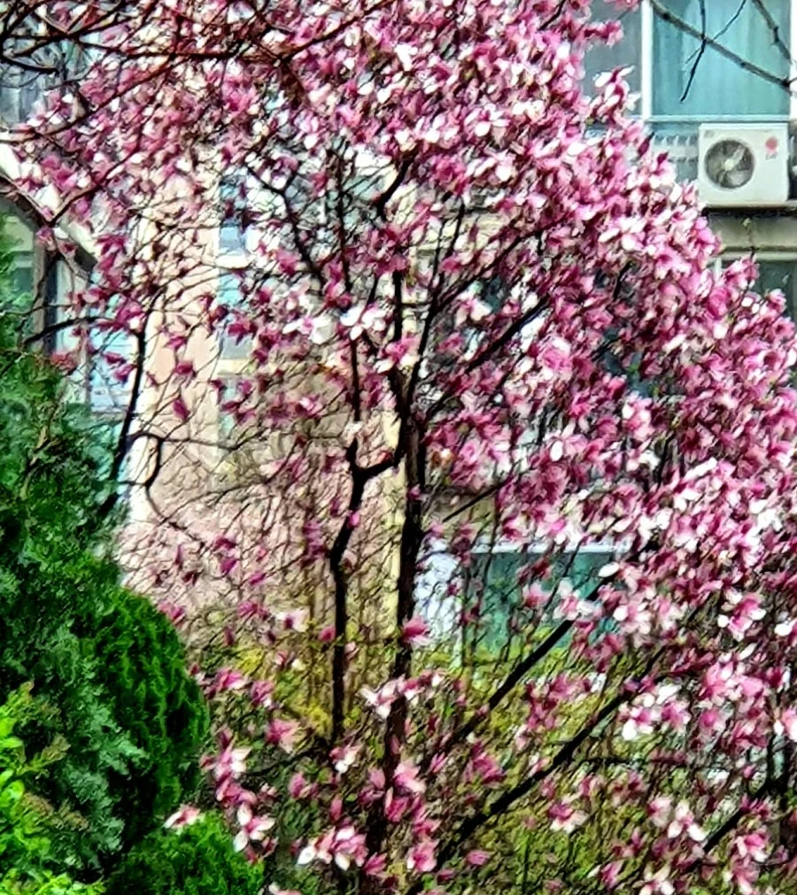 거실에서 아파트 정원을 내려다보니 백목련꽃은 이미 시들어 떨어졌고, 산수유는 흔적도 없이 사라졌다. 하지만 자목련꽃은 만개한 채, 아직도 아름다운 자태를 뽐내고 있다.
