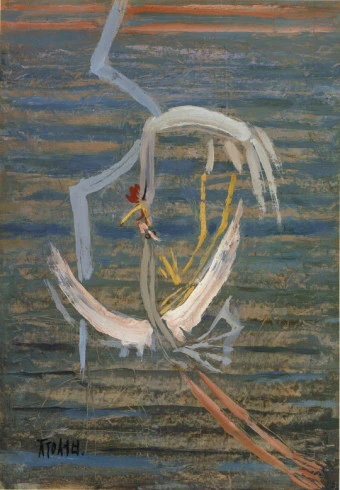 입 맞추고 포옹하는 두 마리의 새를 통해 부부를 묘사했다. 비상하는 수컷과 암컷이 재회하여 서로 입맞춤을 한다. 새의 탄력이 있는 선적인 형상은 아름다운 무희의 원무를 연상케 한다. 경쾌한 동태, 사랑으로 충만된 만남, 즐거운 입맞춤, 모든 고민과 번뇌에서 해방된 기쁨 등이 상승하는 새의 형상적인 선과 앞으로 향하여 상대를 감싸려고 하는 기세를 보이는 날개, 경쾌하고 동적인 자세 등으로 표현되고 있다. 만남의 환희를 고양하는 노란색과 빨간색이 곁들여져 있어 분위기를 한층 밝게 한다고 평한다.
