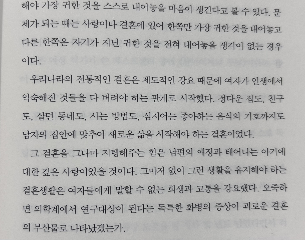 나에게 고통을 주는 가족은 가족이 아니다. 있는 그대로 존중할 줄 모르고 바라는 것만 많은 가족은 가족이 아니다. 함께 있는 것이 더 고통이라면 안 보고 사는 것도 방법이라는 말들이 이해는 가지만 참 씁쓸하다. 행복해야 될 결혼 생활이 이런 고질적인 문제들로 더 이상 망쳐지지 않았으면 좋겠다. 결혼이 좋지 않은 문화로 전락하지 않았으면 좋겠다.