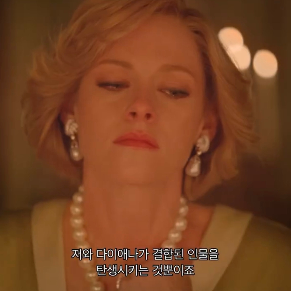 크리스마스이브날 왕실 가족들과 함께한 식사 자리에서 그녀는 견딜 수 없는 괴로움에 꿈틀거리다 이내 목걸이를 잡아당겨 끊어버리고는 수프 위로 떨어진 진주들을 숟가락으로 떠 입속으로 마구 집어넣는다. 스펜서의 괴로움을 보여준 영화적 표현이었지만 마치 스펜서 자신의 눈물을 억지로 삼키는 듯했다.