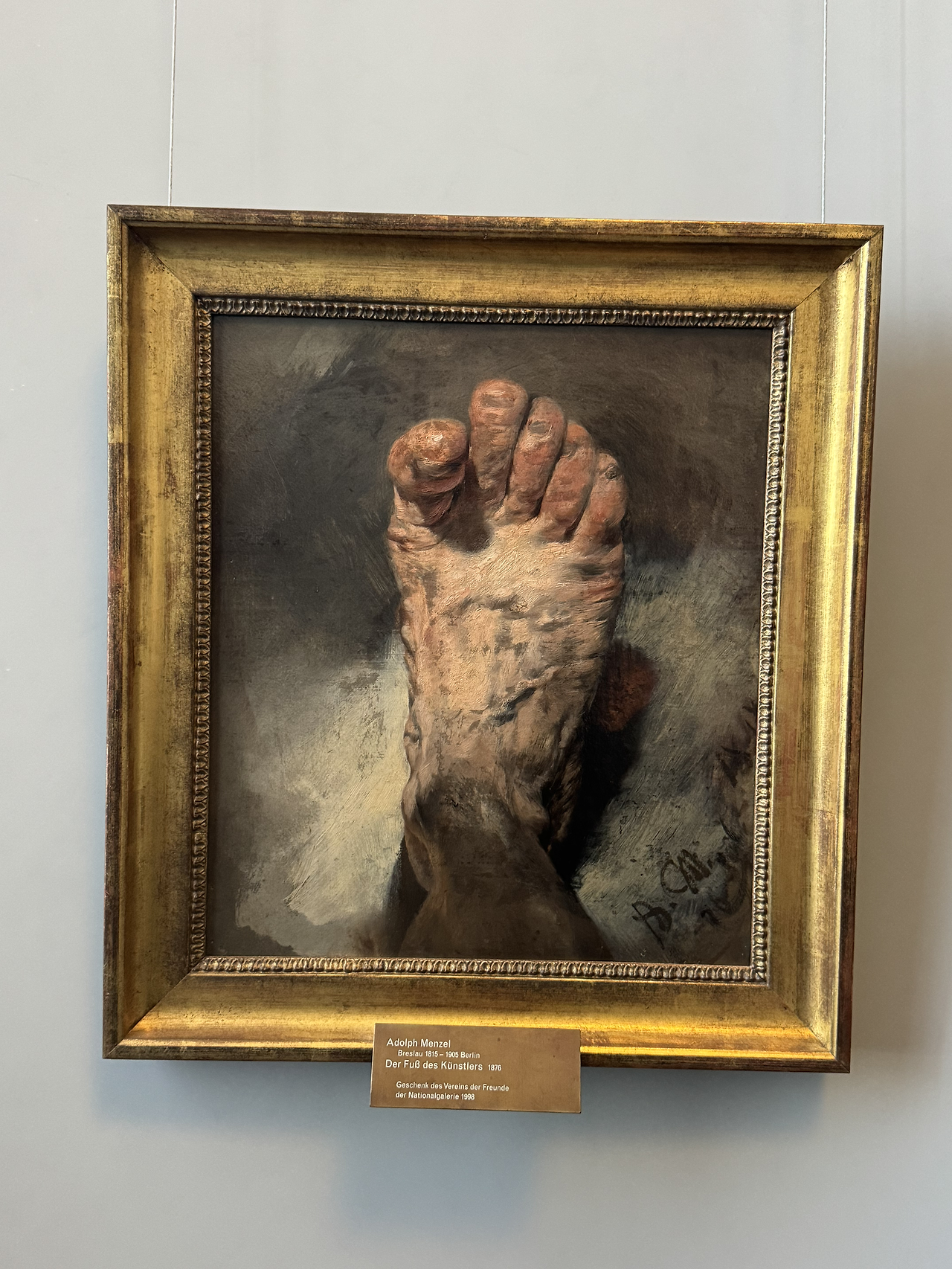 아돌프 멘젤이란 화가의 작품을 만났다. 작품 중 “예술가의 발”이라는 작품이 발길을 사로잡는다. 포기하지 않는 집념이 만들어낸 오랜 노력의 흔적이랄까. 하지만 슬퍼 보였다, 내 카톡의 프로필 사진으로 사용하기로 했다. 막스리버만, 카알프리드릭 쉰켈(멀리 있는 빛), 칼 브레헨 등의 작가들 작품을 만났다.