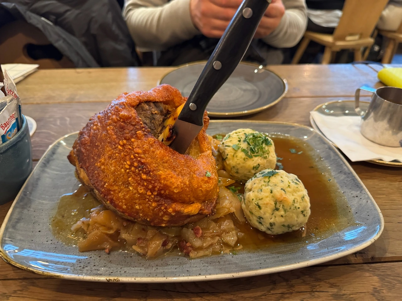 슈바인스학세(Schweinshaxe)는 돼지다리를 구워서 만드는 독일 바이에른 지방의 요리이다. 독일어를 글자 그대로 풀이하면 돼지(Schwein)+무릎(Hạ̈chse Haxe). 한국에서 가장 유명한 독일 요리 중 하나이다. 정작 바이에른에서는 슈바인스학슨(Schweinshaxn)이라는 이름으로 불린다. 독일의 일부 지방에서는 아이스바인(Eisbein)이라고 부른다. 오스트리아에서는 슈텔체(Stelze)라고 부른다. 우리가 소갈비를 매일 먹지는 않듯이 매일 먹을 수 있는 음식은 아닌 것 같지만 튀긴 것같이 바삭한 껍데기와 찐 듯 부드러운 살코기 압권이다.