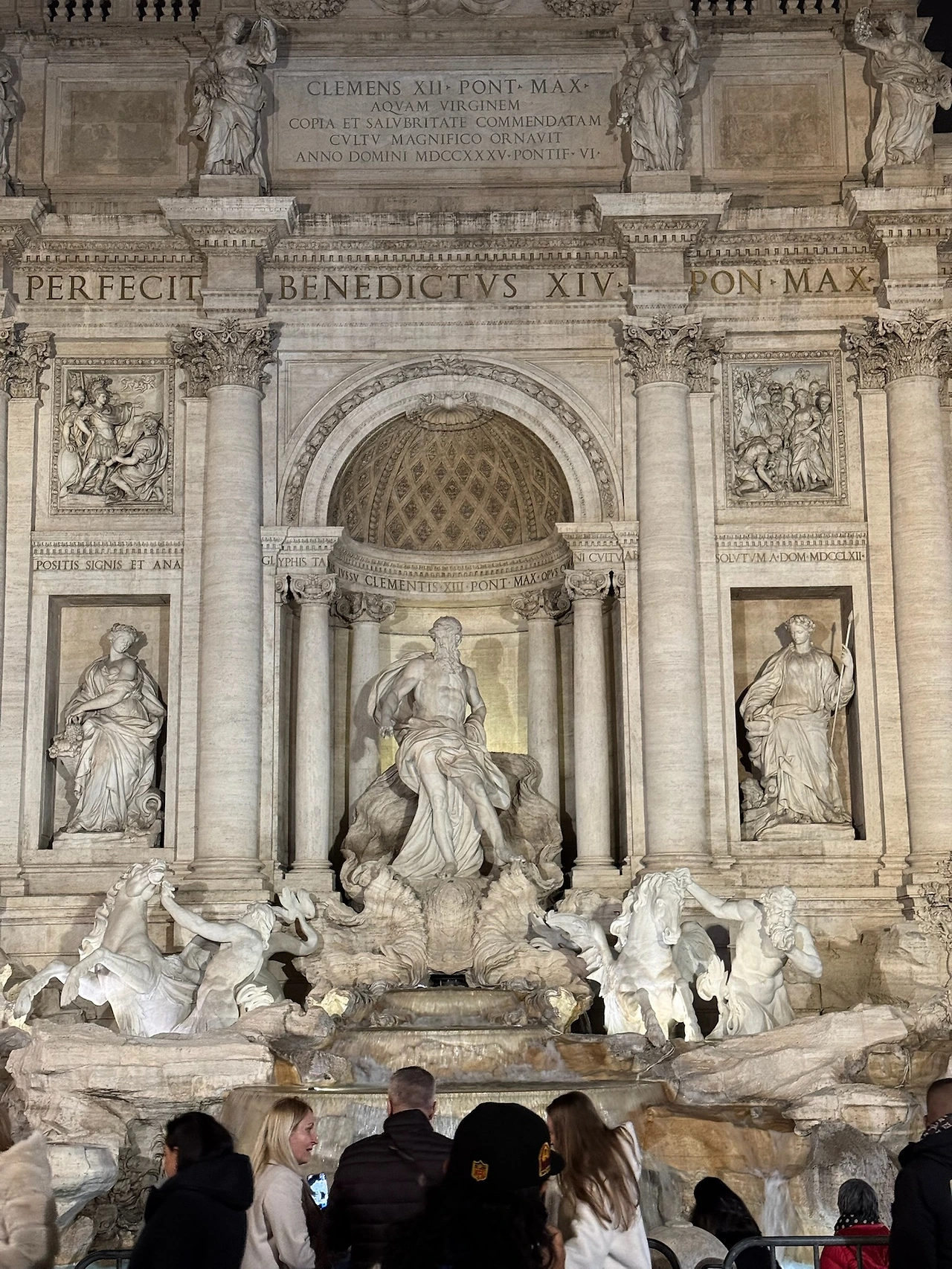 트레비 분수는 그야말로 장관이란 표현 그 자체로도 부족하다. 도심 한 모퉁이에 있을 것 같지 않은 웅장한 규모(아마도 분수가 생기고 난 후 주변 도심이 조성된 것은 아닐지?). 아치를 중심으로 상하좌우의 조각상들, 해초와 나뭇가지, 물살까지의 그 디테일… 분수 바로 앞에 지금도 미사를 봉헌하는 Church of Saint Vincent and Anastasius 성당과 베네통 토털 샾이 있다는 점이다.