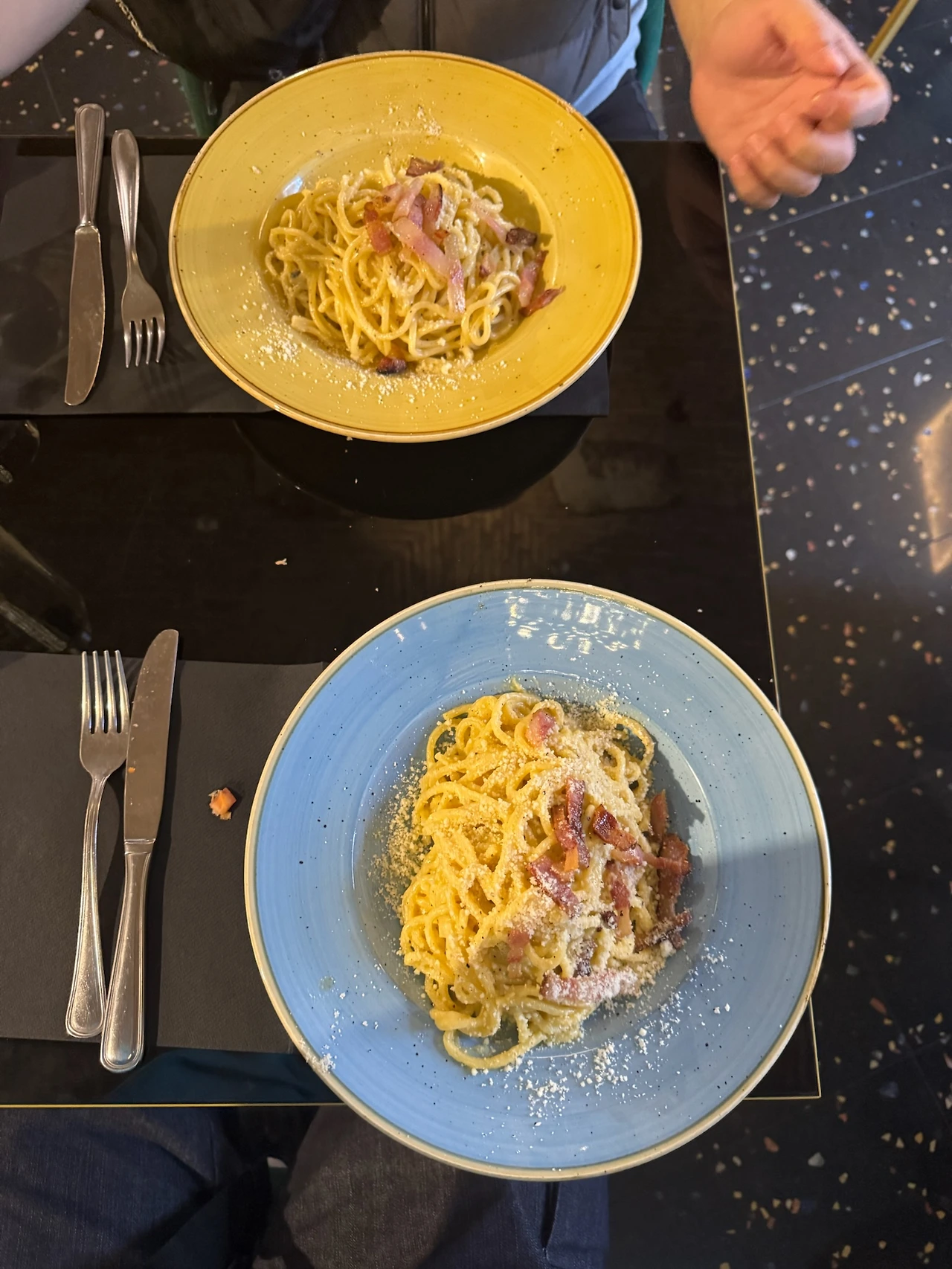 까르보나라를 주문. 잘 세팅된 테이블. 벽면의 장식한 모던하면서도 고풍스러운 그림과 기타 미술품. 그리고 세련된 조명과 인테리어.