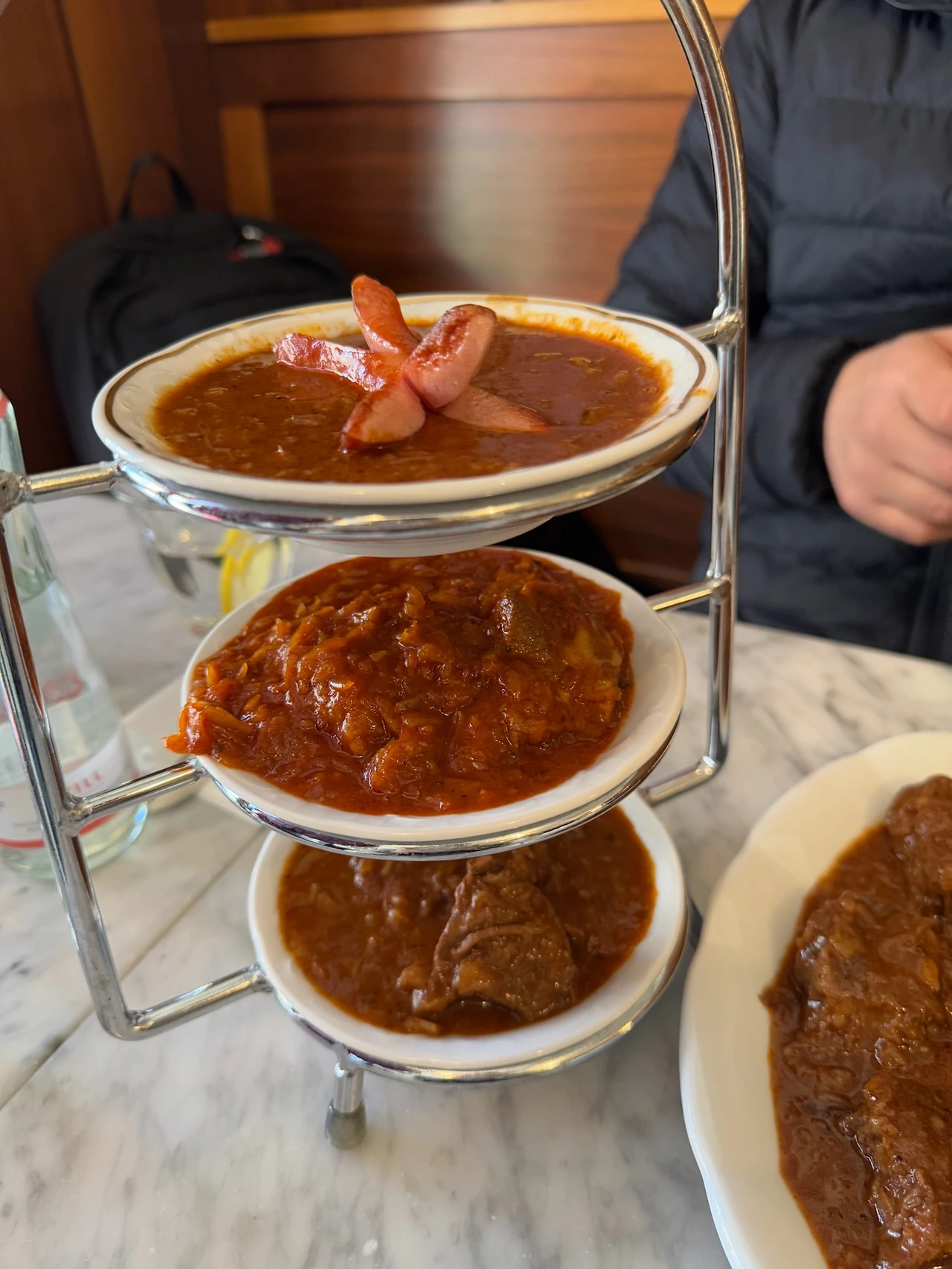 12시. 헝가리 전통음식을 오스트리아식으로 요리한 굴라쉬를 먹기 위해 Gulasch & Soehne Vienna(Schubertring 10-12, 1010 Wien, 오스트리아, 구글별점 4.4)를 방문 일반소스와 양배추 소스의 굴라쉬와 비엔나소시지. 굴라쉬의 소고기 맛은 왠지 타펠슈피츠의 고기 식감과 비슷했지만 소스에서의 맛의 차이가 확실했다. 대 만족 (현지식 먹다 보니 한 끼 식사 부담이