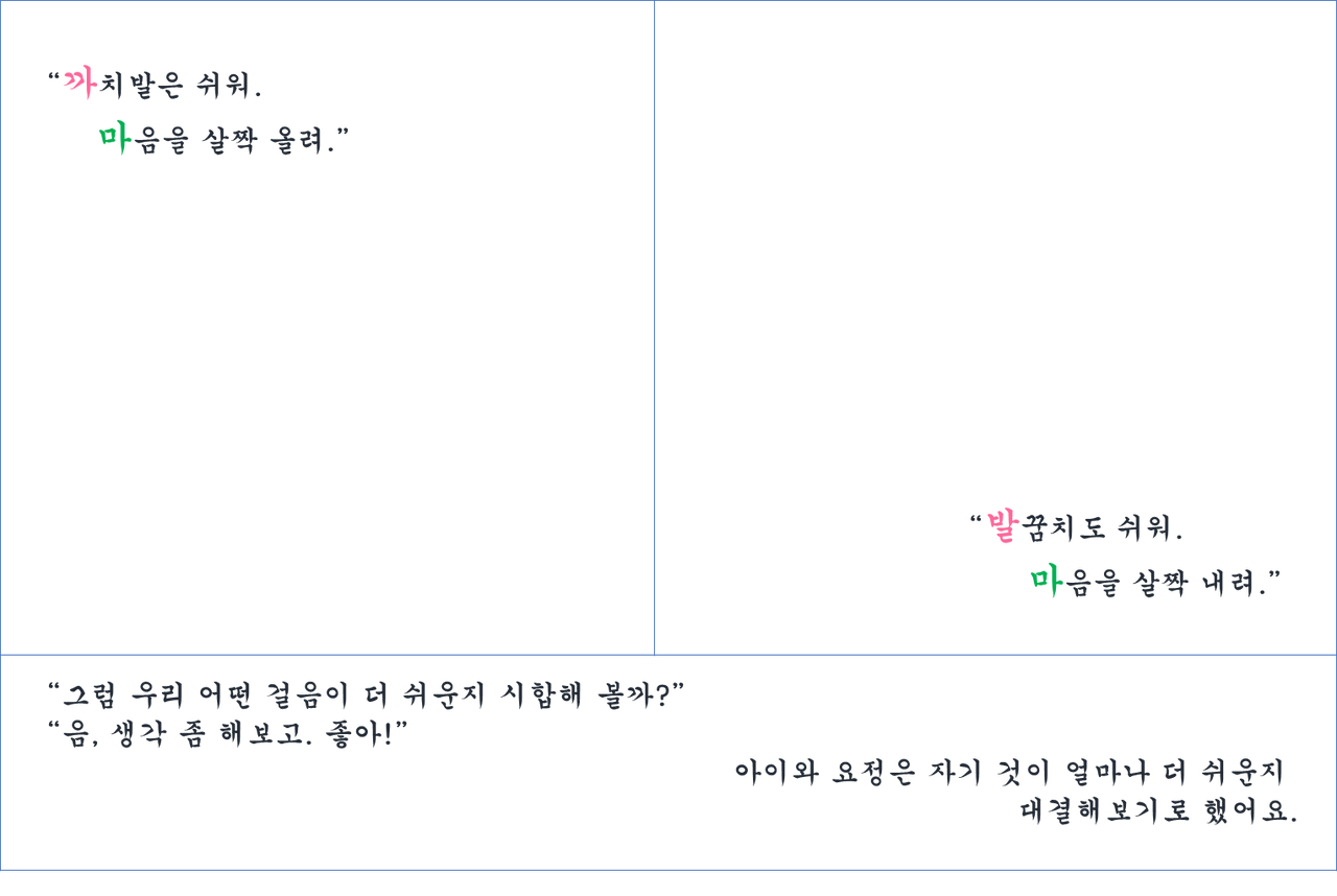 성장하는 아이들의 발달에 따라 부모로서 우리가 느끼는 점들도 계속 변화하니 고민도 달라지는 것 같아. 대부분은 시간이 흐르면서 자연스럽게 사라지기도 하지만 환경을 열심히 개선해서 더 잘 키우려고 정말 노력을 많이 하기도 해. 난 너에게서 아들 체격을 걱정하는 엄마의 모습을 상상해 본 적이 없었는데, 편지를 읽고 이 친구가 꽤 진지하게 이 문제를 생각하는구나 싶었어. 민우는 정말 신체를 잘 쓰고 운동 감각이 탁월하니까 그쪽으로는 걱정할 일이 없겠거니 했단다. 오히려 그 걱정은 나에게 있었지. 우리 아들의 만성적인 까치발. 나의 숙원 과제. 마음속 깊은 곳에서는 마치 내가 원죄를 지은 것처럼 마음이 힘든 날도 많았어. 오죽하면 작년 가을 그림책 기획과 창작 과정에서 ‘까치발자국’이라는 제목으로 그림책 더미북을 만들었겠니. 처음에 그걸 기획하고 글 원고를 쓰고 노력해도 잘 안 되는 그림을 억지로 쥐어 짜내 마침내 더미북을 완성했을 때 후련한 기분이 들면서도 서러운 눈물이 마구마구 흐르더라. 최종 발표 날에 너와 동기들 앞에서 펑펑 울었던 기억이 생생해. 너무 부끄럽지만 멈출 수 없었고, 아직까지 정확한 이유도 알아내지 못하겠어.