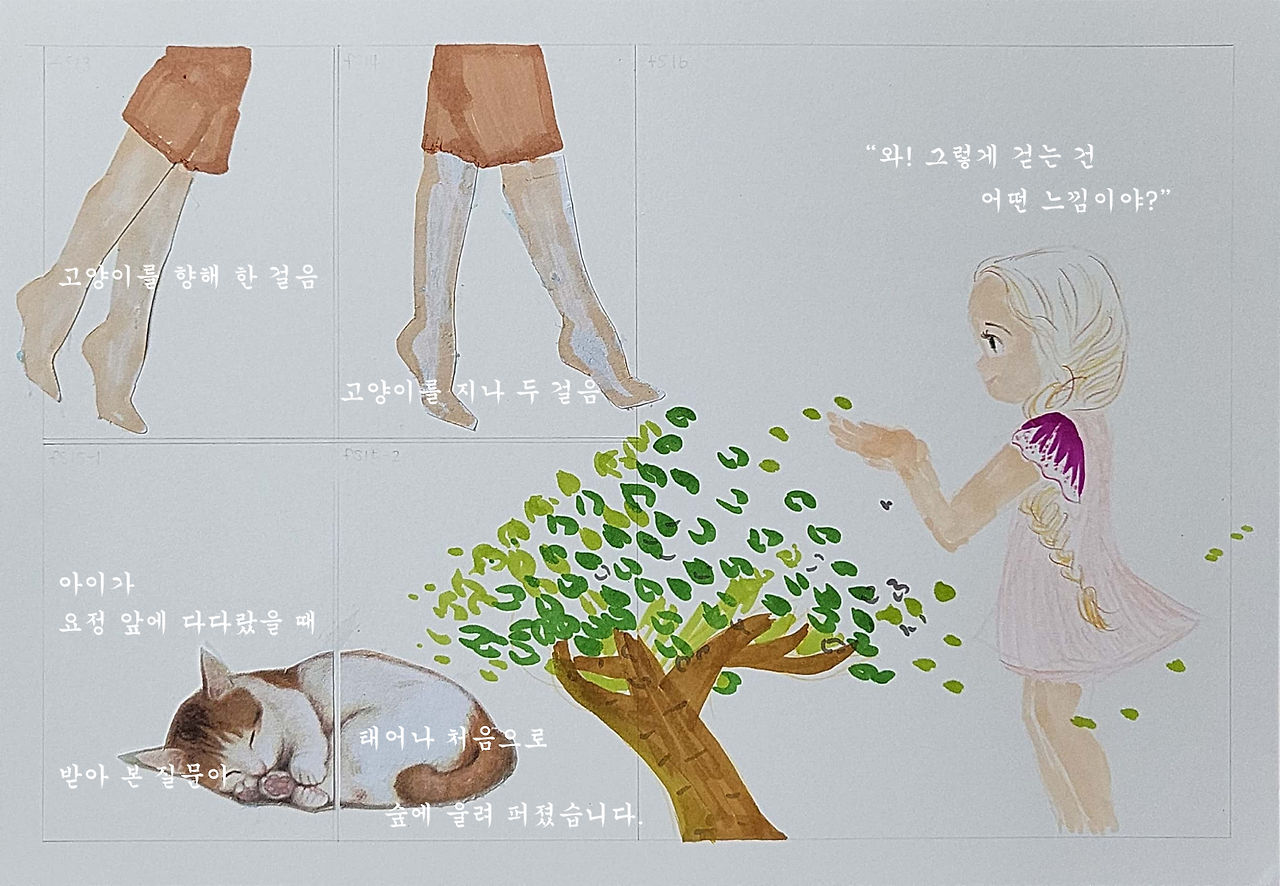더미 그림책 [까치발자국]에서 어쩌면 내가 그 마음에서 해방되고 싶었을지 몰라. 주인공 아이가 까치발로 또래들과 놀이에서 금세 넘어져 학교 숲으로 들어가잖아. 우선은 회피 본능이 있던 것 같아. 나 자신과 내 마음이 더 이상 다치고 싶지 않았으니까. 그런데 학교 숲에 들어서서 어디에선가 부는 바람결을 느끼고 환기가 되기 시작해. 환상 속에 등장하는 요정 말이야. 그거 내 페르소나야. ^^ 그 요정과 까치발 소년이 서로 대결을 하면서 어떤 발걸음이 더 좋은지 대결을 하잖아. 그렇게 흑백 논리로 시작된 대결이 결국 그런 것들은 다 상관없다고, 우리가 함께 어우러져 그 시간을 즐겁게 만끽했다면 충분하다 외쳐. 같이 이 놀이를 끝까지 해내는 게 의미 있다는 걸 독자의 마음에 꾹꾹 눌러 담아주고 싶었어. 우리 아이가 까치발이든 아니든 우리 가족이 남은 나날들을 기꺼이 행복하게 함께 할 것이라는 약속을 내 마음에 새긴 것처럼 말이야.