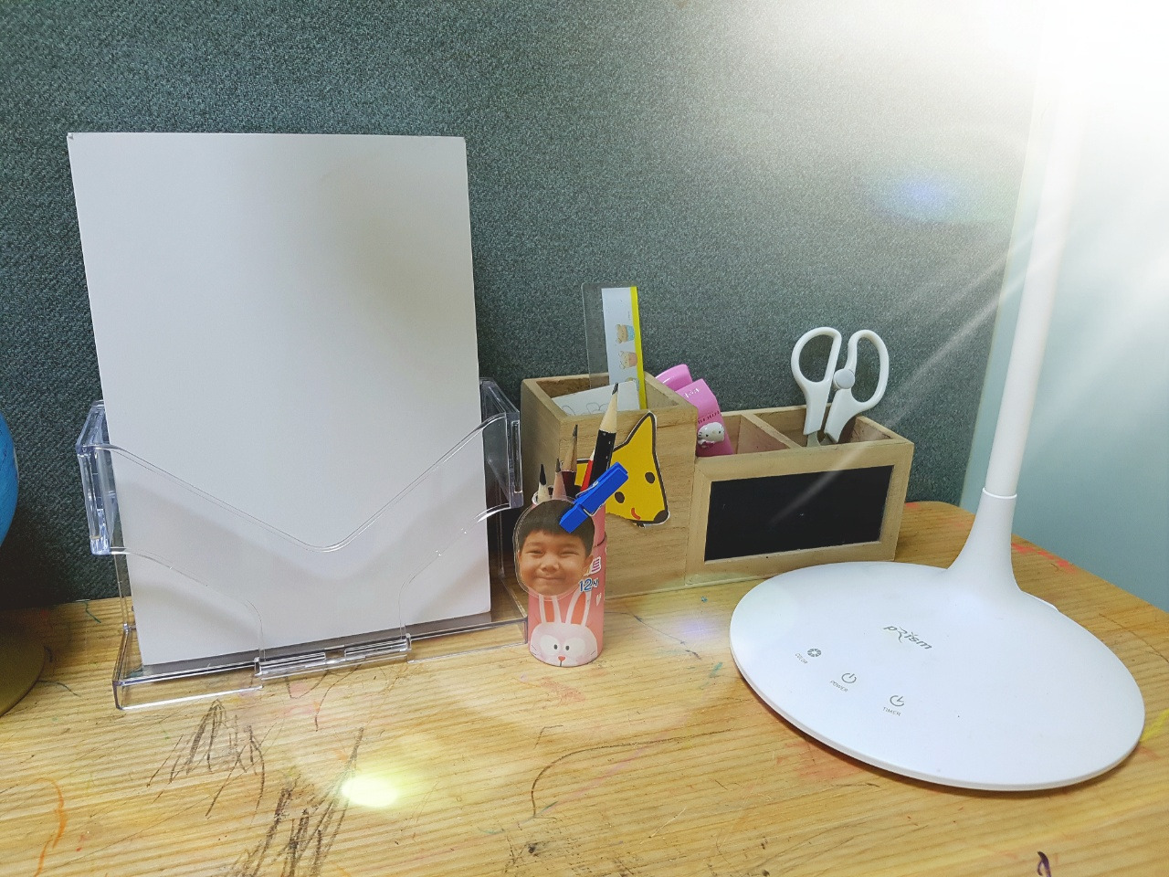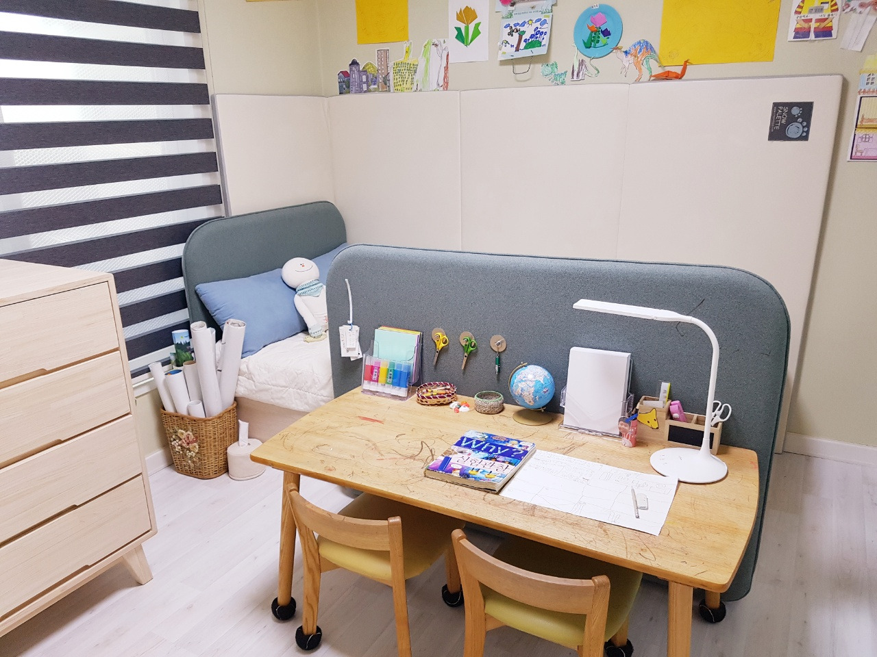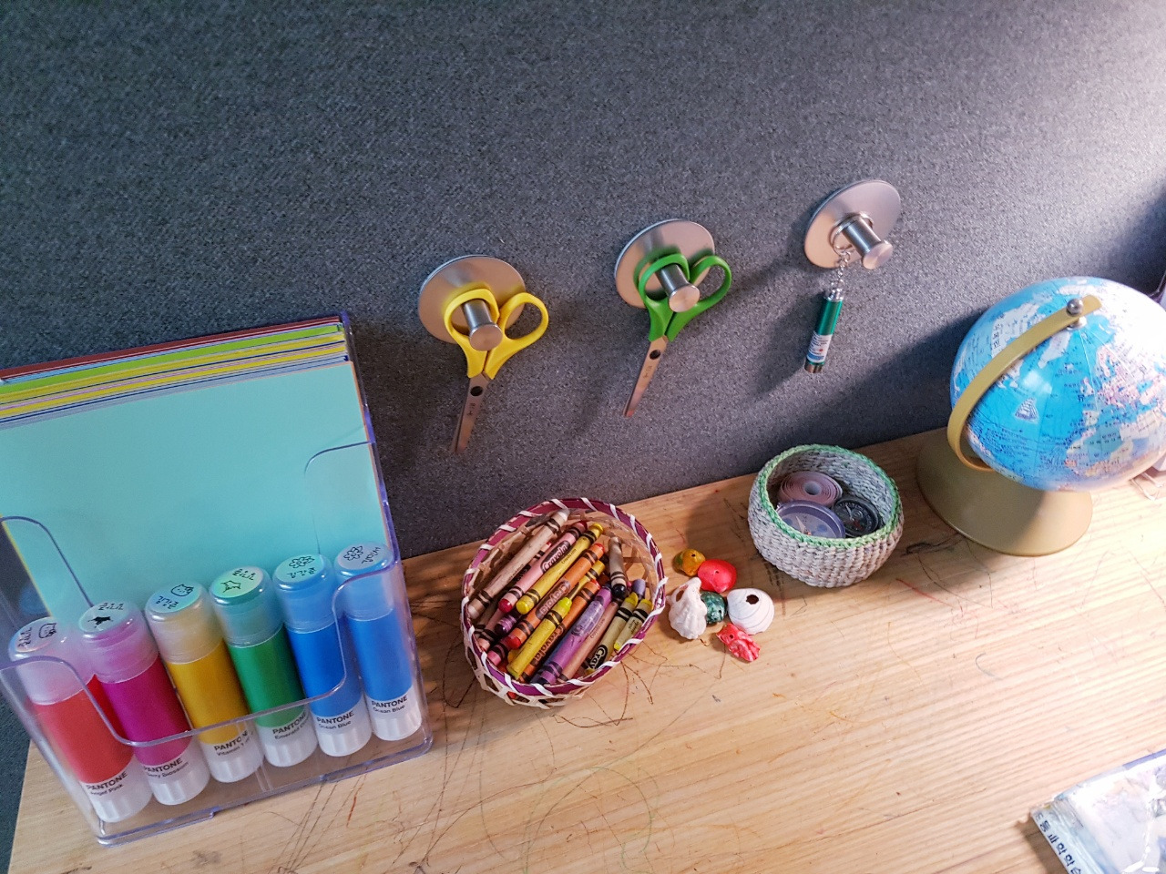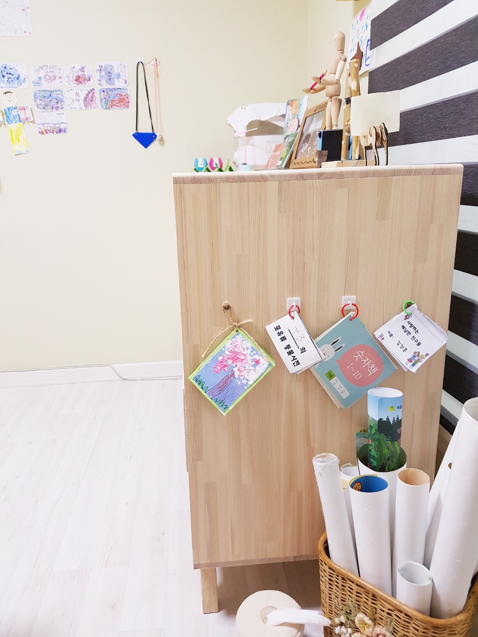 현재 7세 신통이가 방에 들어서자마자 보이는 장면이다. 파티션 좌측부터 수작업한 그림책이 걸려있고 색종이와 색색 풀, 유아 가위, 색연필, 손전등, 나침반, 줄자, 지구본, A5용지, 펀칭기, 램프 등이 비치되어 있다.