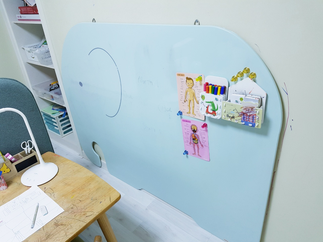 아이가 끄적이다 모르는 게 있어 물어볼 때 이 대형 칠판에 그리면서 설명을 해준다. 또는 인체 혈관이나 근육, 내장기관 같은 그림을 자석으로 붙이는 용도 내지 새로운 개념을 설명하는 공간으로 쓰이고 있다.
