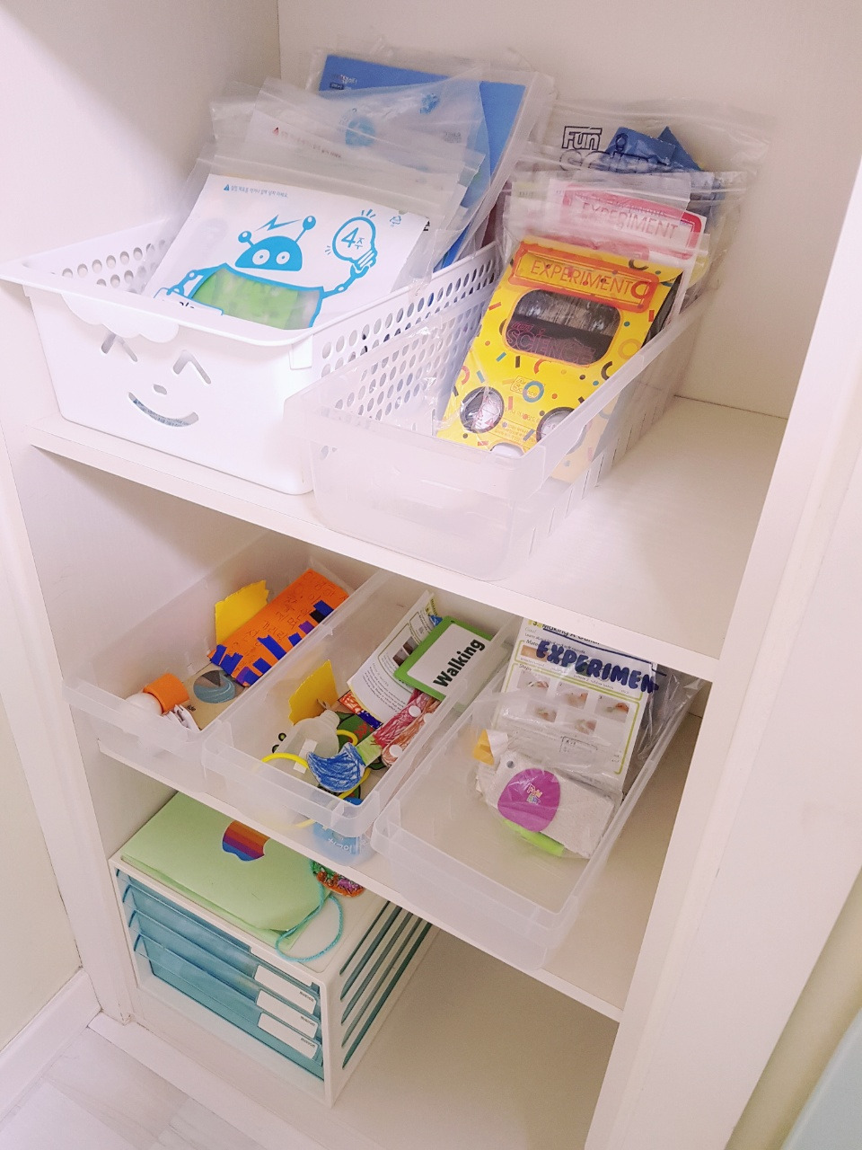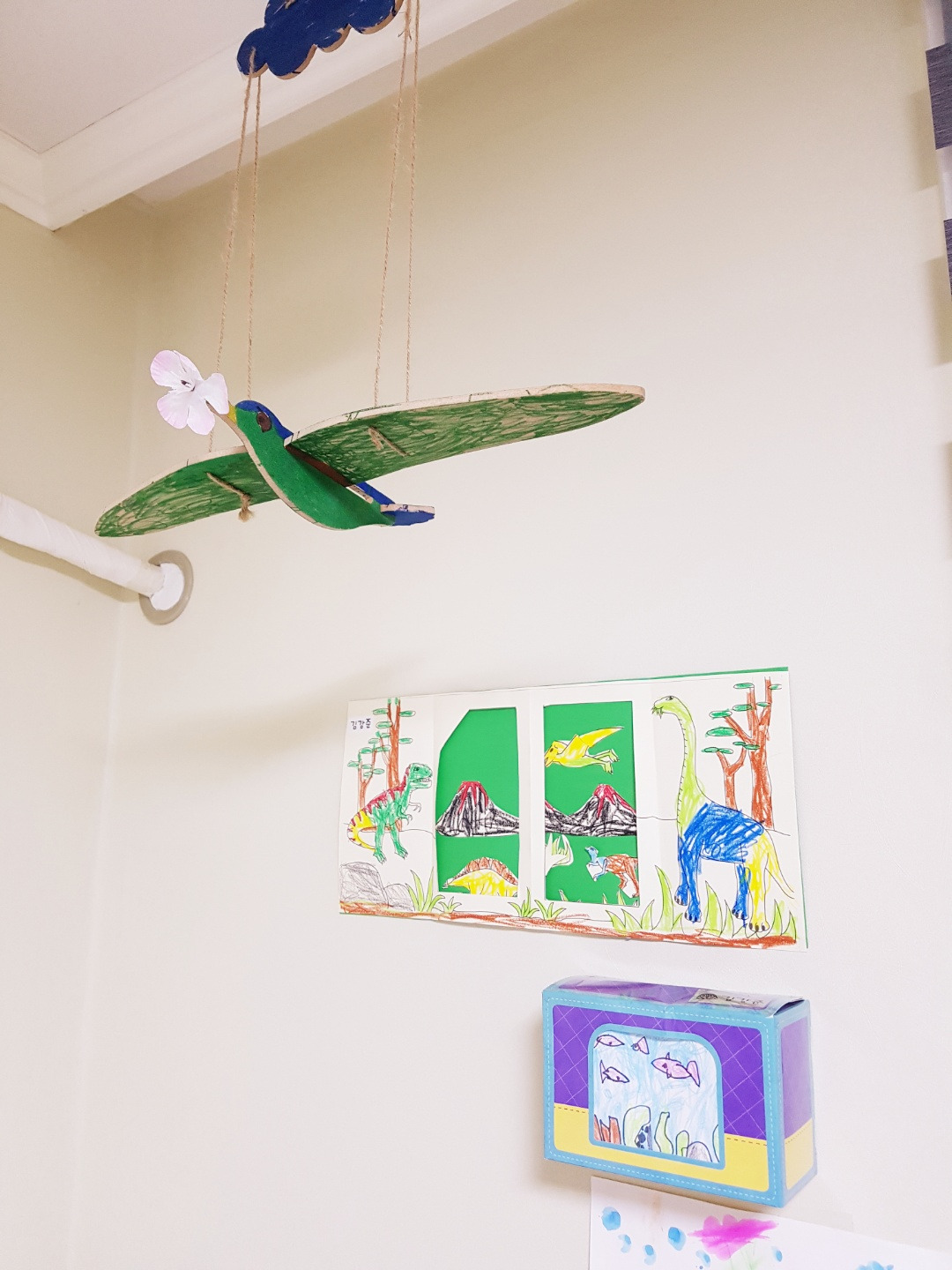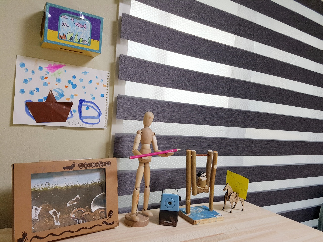 가정, 유치원, 스팀교육 기관을 통해 스스로 만든 것까지 어떠한 작품이든 공간에 전시하고 있다. 아이가 친구들이나 손님이 왔을 때 자신감 있게 설명할 수 있도록 한 배려이다. 아이들도 꽤나 자기 효능감을 확인하는 것을 즐기는 것 같다.