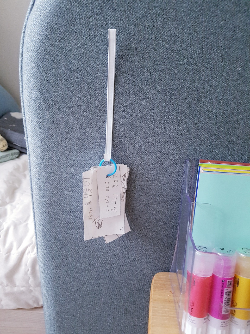 이렇게 아이가 만든 책을 모아 보면 아이가 놀이를 하면서 어떻게 상호작용을 했을지 상상이 되곤 한다. 이 각도는 아이가 침대에 누워 바로 고개를 돌리면 보이는 장면이다. 이제 잘 시간이란 습관에 길들여졌지만 터벅터벅 방으로 향하는 그 뒷모습을 볼 때면 항상 기특하기도 하고 짠하기도 하는 양가적인 감정이 동시에 온다. 침대에 홀로 누웠을 때 바로 잠이 오지 않을 때 아이의 시선이 가장 먼저 닿을 그곳이 엄마를 그리워할 지점은 아닐까... 아이는 동생을 위해 만 3세 때 수면 독립을 해내었다. 그런 아이를 위해 내가 할 수 있는 최고의 선물은 무엇일까 생각하고 또 생각했다. '자긍심' 그걸 선물하고 싶었다.