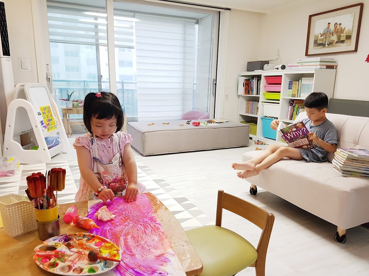 육아 동선을 구상할 때마다 모든 시각을 철저하게 아이 관점에서 설계하던 원칙이 있었다. 이 방도 신통이 발달 과정에 따라 구색을 갖추기 시작했다. 신통이는 돌 전부터 수과학적 교구에 몰두하는 면이나 글을 알아서 깨치는 면이 있었지만 지금의 집중도가 타고난 것인지 아니면 아주 아기 때부터 효과적인 육아 동선을 제공받으며 자라 그런 건지는 알 수 없다.