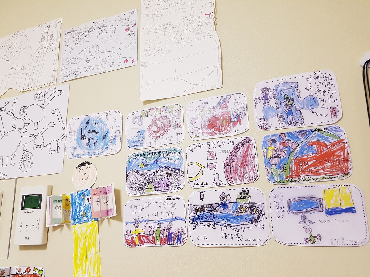 아이가 원에서 매주 주말 지낸 이야기를 그려오는데 7세 때부터는 한쪽 벽면에 그림을 모으기 시작했다. 6세 때까지는 방통이 두 돌까지 정신없이 남매 육아를 해내느라 여유가 부족했다. 그 당시는 이런 것들보다는 남매가 가족 안에서 잘 적응하고 화목한 하루하루를 지내보는 연습이 가장 중요하다 판단했다. 그 선택은 옳았고 신통이 방통이는 남매 그림책을 내도 좋을 만큼 우리를 감탄하게 할 다양한 에피 소드를 만들어 나가고 있다.