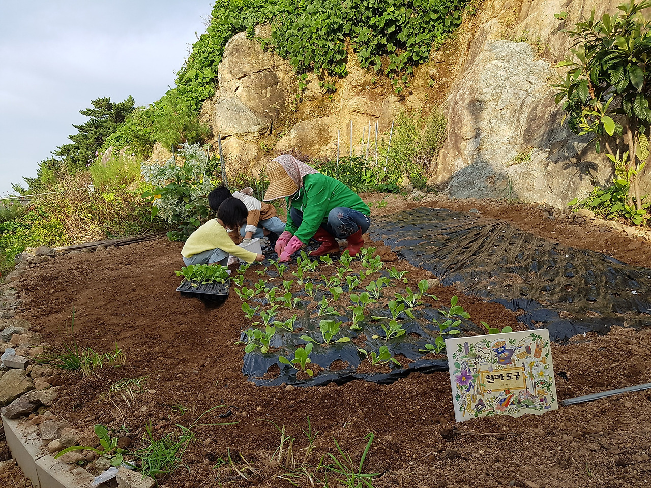 할머니 텃밭에서 마늘과 배추 모종 심기