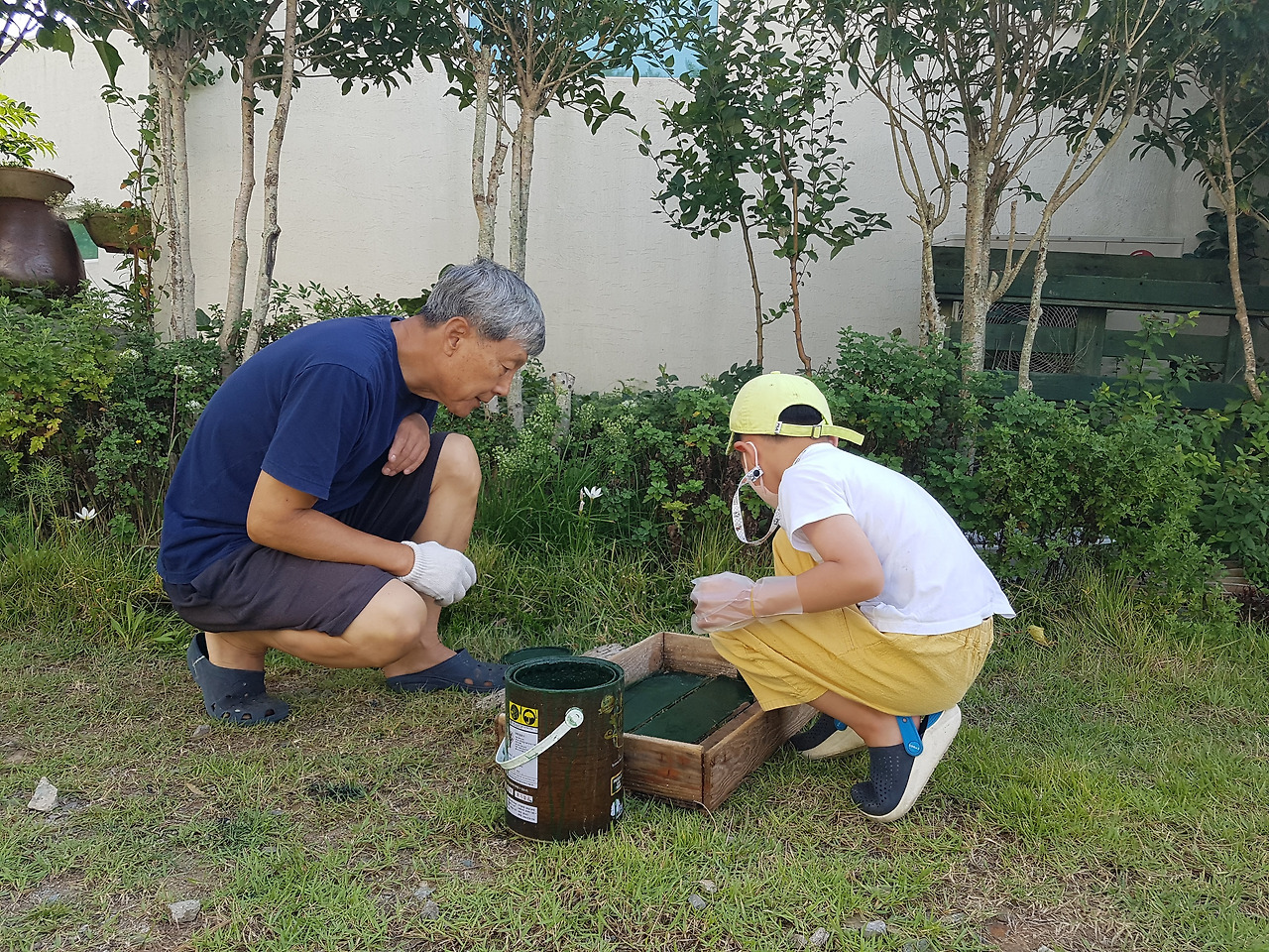 할아버지와 폐품에 페인트칠 해서 물건을 재탄생시키기