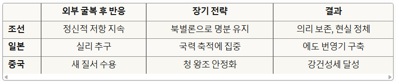 놀랍게도 비슷한 패턴을 발견할 수 있어요. 한국은 여전히 외부 압력에 대해서는 끝까지 저항하지만, 때로는 현실보다 명분을 중시하는 경향이 있습니다.