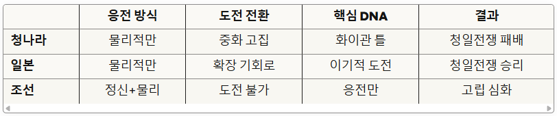 청나라는 화이관 때문에 개혁을 망쳤고, 일본은 확장 DNA로 기회를 잡았으며, 조선은 응전 DNA로 고립되었어요.