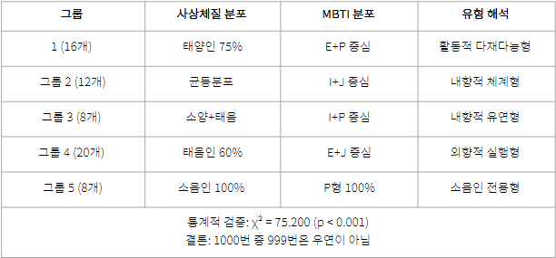 이 표가 보여주는 건 정말 놀라워요. 몸의 특성(사상체질)과 마음의 특성(MBTI) 사이에 실제로 의미 있는 연관성이 있다는 거거든요.