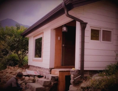 남편은 아침을 먹으면서 3단의 돌계단이 있는 황토방 오른쪽 지붕에서 떨어지는 빗물받이