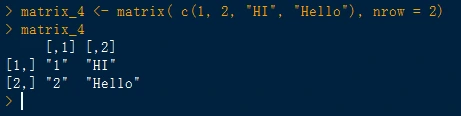메트릭스 또한 벡터처럼 두 가지 이상의 자료형이 입력되었을 때 한 가지 자료형으로 Coercion 되는 모습을 확인할 수 있다.