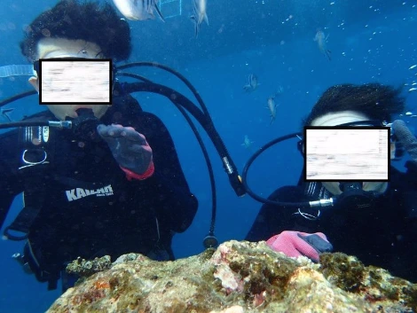 한참을 스노클링 하면서 놀다가 지루해졌을 때쯤, 스쿠버 다이빙할 차례가 왔다. 지시에 따라 장비를 챙겨 입고, 입수했다. 전문 다이버가 나와 친구의 손을 잡고 이끌어 준다.