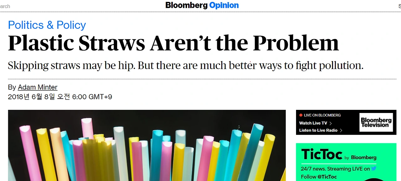 블룸버그 통신에 위와 같은 사설이 실렸다. 플라스틱 빨대 안 쓰기 운동은 힙할 수는 있으나, 오염을 줄이는 방법은 따로 있다는 것이다.