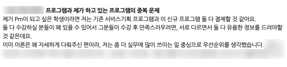 내가 신규 프로그램 제작을 시작할 때 이미 프라임커리어에는 다른 PM 프로그램이 있었다. 가격이 시중가 대비 막 비싸진 않은 편이라, 학생분들이 간절한 마음에 여러 프로그램을 수강하는 경우도 있을 것 같았다. 그런데 내용이 비슷하면 수강에 대한 만족도가 떨어질 거다. 그래서 핵심적인 내용은 빠짐없이 담되, 기존 프로그램과 차별화된 요소를 더하는 데 집중했다.