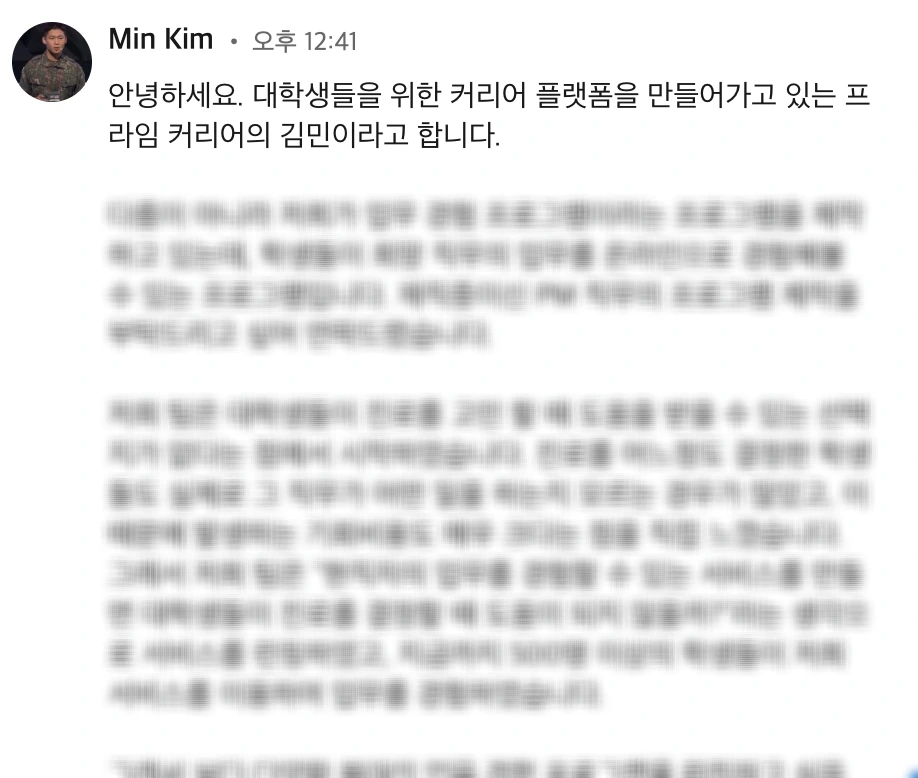 작년 말에 프라임커리어의 대표님께 링크드인 메시지를 하나 받았다. 프라임커리어는 대학생들이 진로를 고민할 때 현직자의 실제 업무를 알기 너무 어렵다는 문제에 주목한 스타트업이었다.