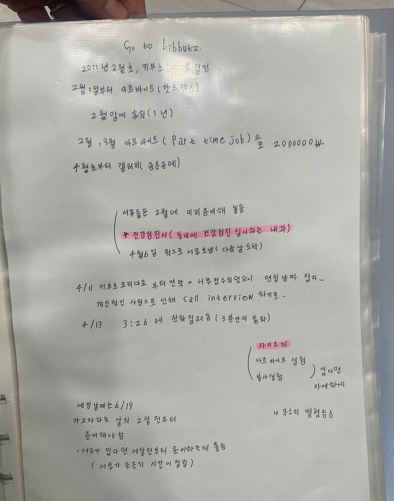 이스라엘로 날아가기 위해선 먼저 키부츠 코리아 지부에 원서 접수를 한 후 영어 인터뷰를 진행해야 했다. 나는 3개월 정도의 시간을 두고 준비하기로 해서 4월까지 인터뷰에 나올만한 질문(지원 동기, 계획, 포부 등)과 답변을 작성해 달달 외우다시피 했다.