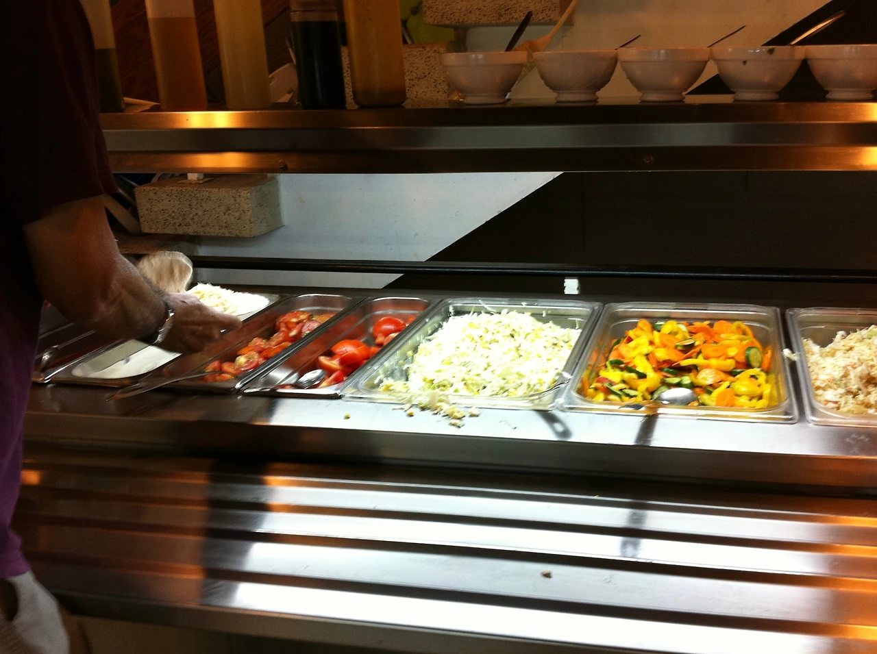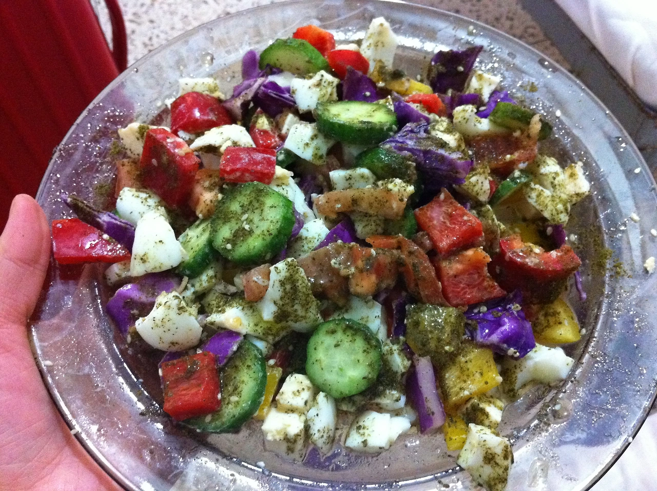 나는 먼저 일하고 있던 이스라엘인 에이나브의 설명으로 여러 샐러드용 야채와 삶은 계란을 가져왔다. 잘리지 않은 재료들을 식판에서 잘게 자르고 올리브오일과 소금, 후추, 그리고 어떤 가루(큐민가루였던 것 같다)를 함께 넣어 먹고, 빵에는 버터와 과일잼을 발라 먹었는데, 이런 아침 메뉴는 언제 먹어도 질리지 않았고 6개월 내내 나의 고정 아침 식단이 되었다.